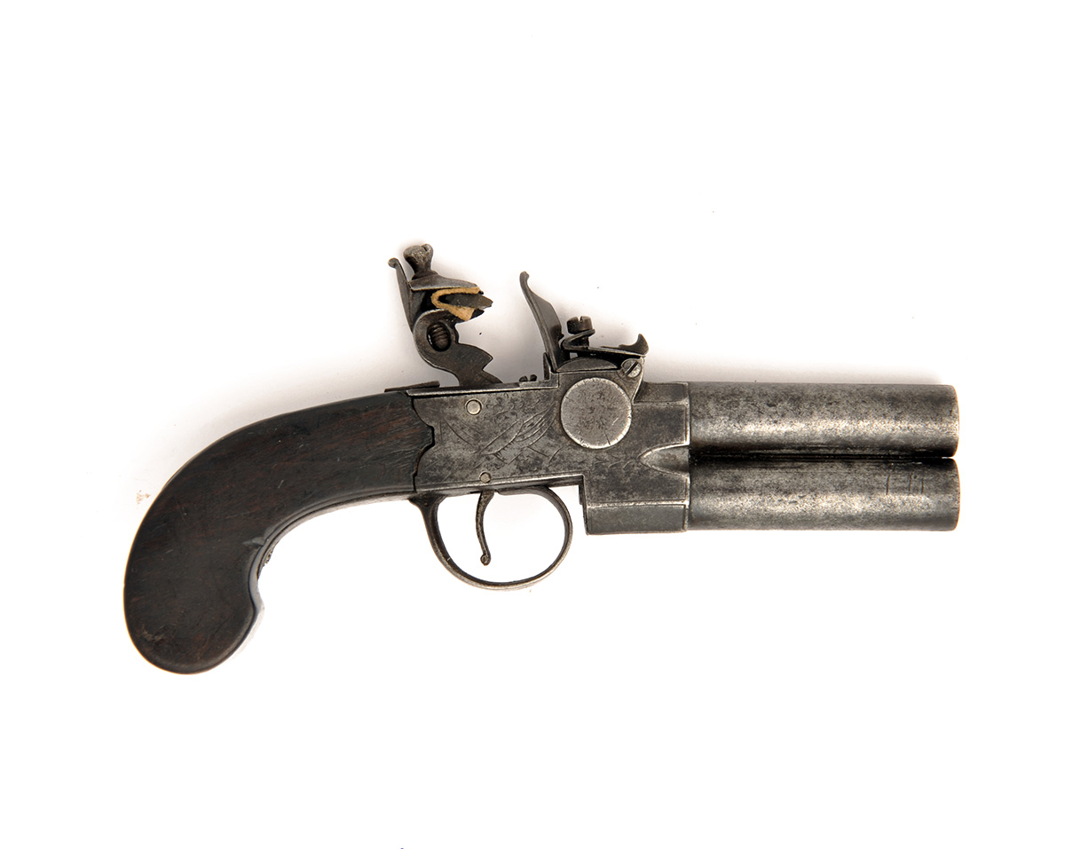 A 40-BORE FLINTLOCK TAP-ACTION OVER-UNDER PISTOL SIGNED DUNDERDALE MABSON & LABRON, no visible serial number,
