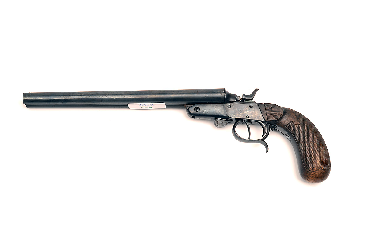A .410 (2 1/2in.) DOUBLE-BARRELLED SHOT-PISTOL, UNSIGNED, serial no. 19, with 9 1/2in. side by side barrels (slightly loose), boxlock action with twin central hammers and push-button barrel lock and chequered walnut bag-shaped butt