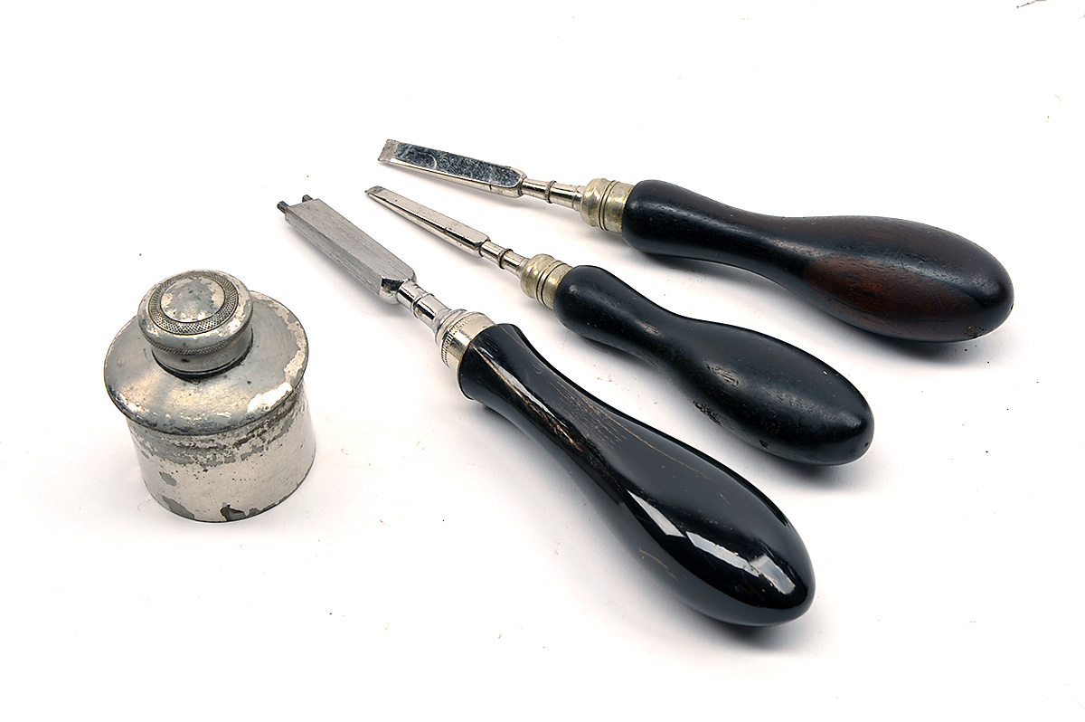 A COLLECTION OF GUNCASE ACCESSORIES, comprising of a vintage oil bottle, a small turnscrew, a medium turnscrew, striker disc remover
