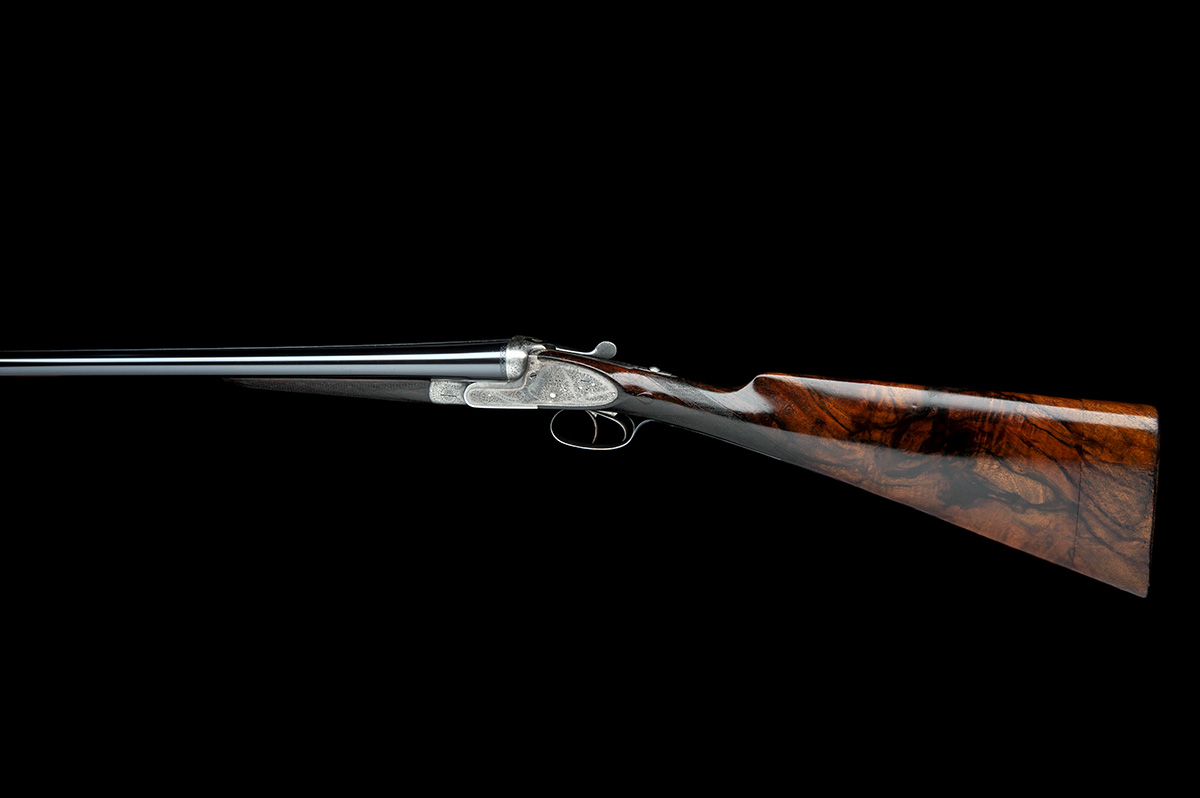 30in. replacement nitro barrels, 2 3/4in. chambers, bored approx. imp. cyl. and 3/4 choke, automatic safety with inlaid 'SAFE' detail, beaded border and acanthus scroll engraving, retaining traces of original colour-hardening and finish, 16 1/2in. figured stock including 2in. wooden extension, weight 7lb. 3oz.