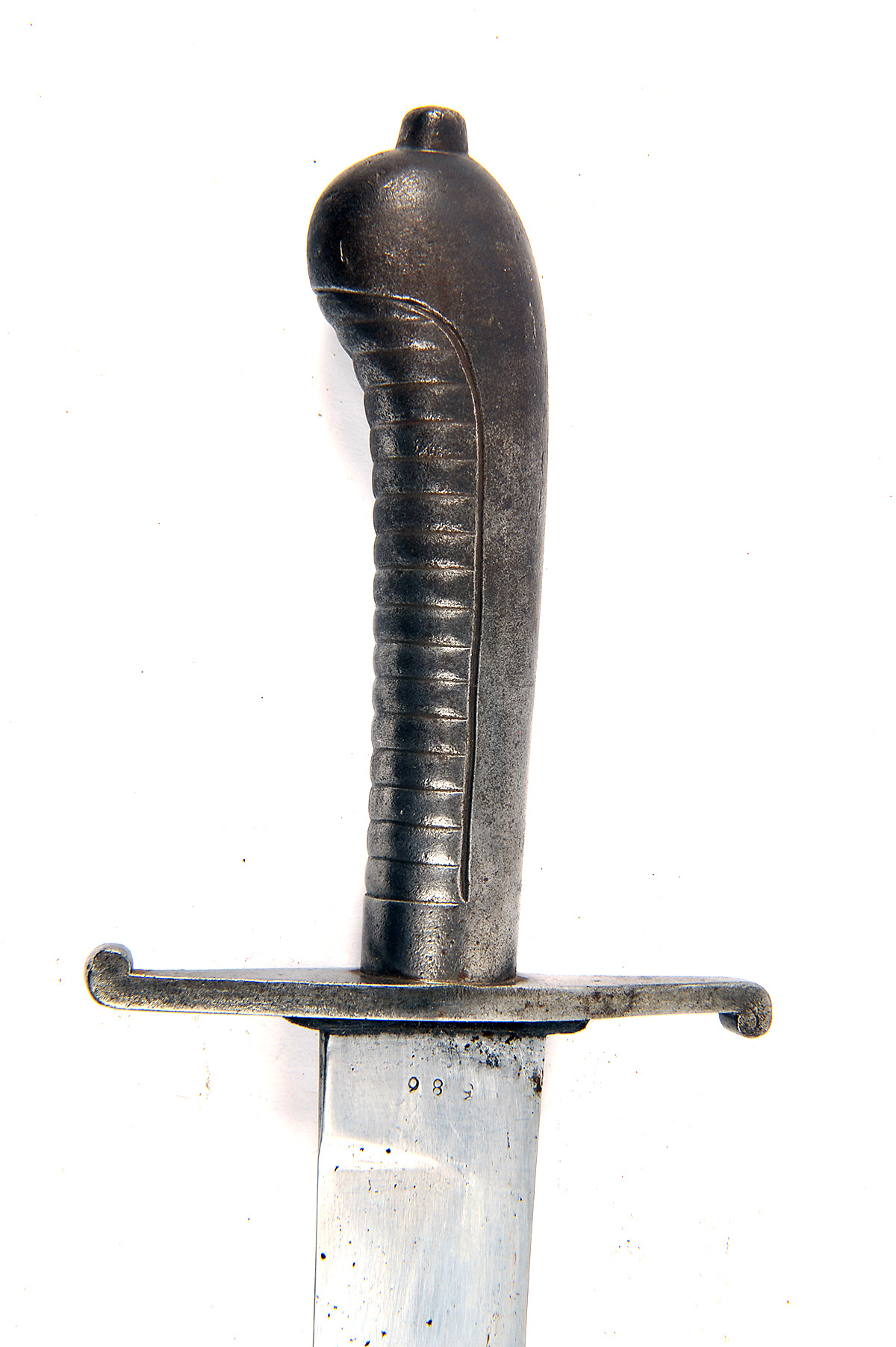 AN ALL STEEL AUSTRO-GERMAN SIDEARM, mid 19th century, with 18 1/4in. falchion-type blade, straight cross-guard with regimental markings and ribbed iron hilt with doveshead pommel, complete with its iron mounted leather scabbard