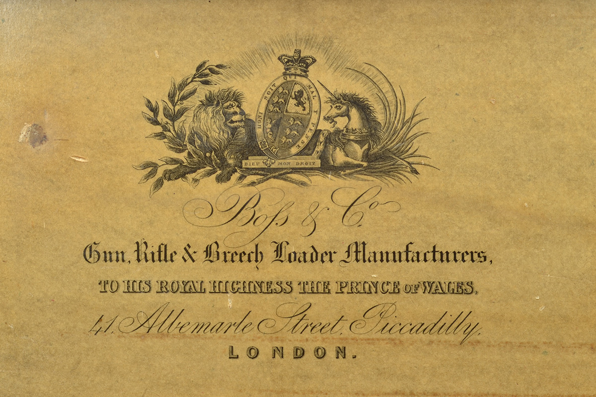 fitted for 29in. barrels, the interior lined with maroon baize, a Boss & Co. trade label, turn screw, oil bottle, central brass push-button lock (including keys), the lid exterior embossed with 'F.W.T. OLD NUNTHORPE, YORK'
