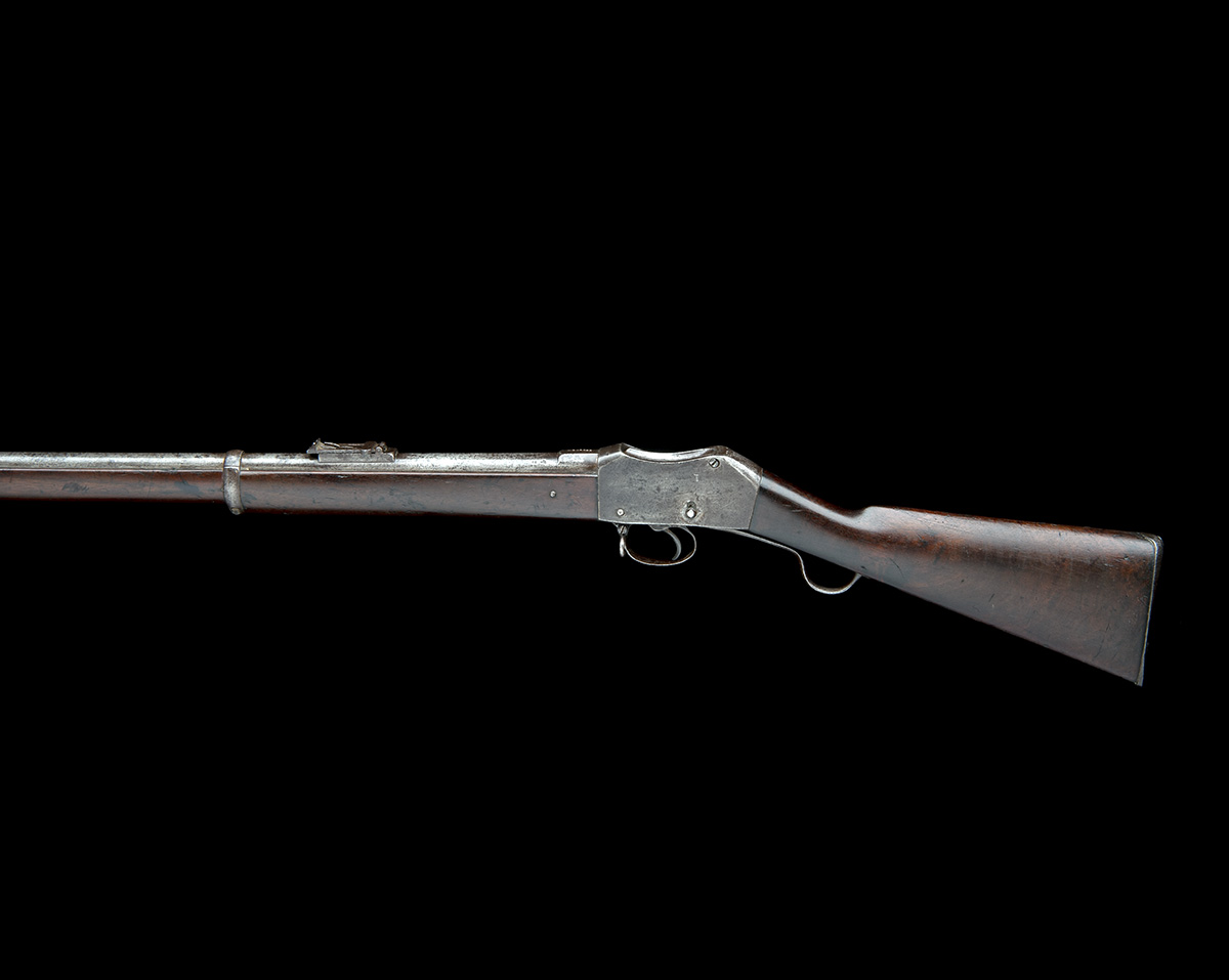 circa 1890, with 33 1/4in. barrel, block and blade fore-sight, elevating ladder rear-sight, the top of barrel signed 'McCARTHY RUCK & Co. LONDON', commercial proofs, plain slab-sided receiver with tear-drop cocking indicator and chequered thumb depression, walnut butt-stock, iron furniture including short under-lever and two barrel-bands and provision for clearing-rod (missing)