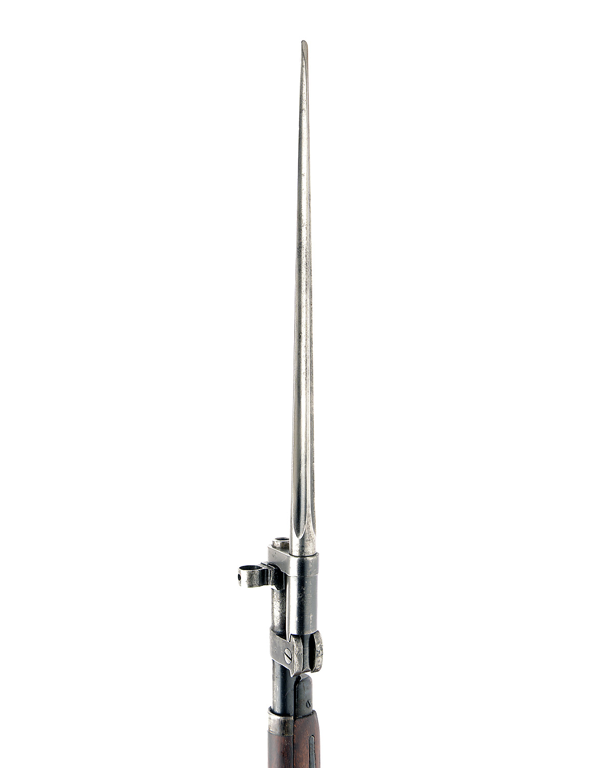 20 1/2in. re-proved nitro barrel, ring fore-sight, tangent rear-sight, no safety, receiver ring with '1948 ', folding bayonet, cleaning rod, hinged floorplate with matching serial No. straight stock with steel butt-plate with non-match serial No.