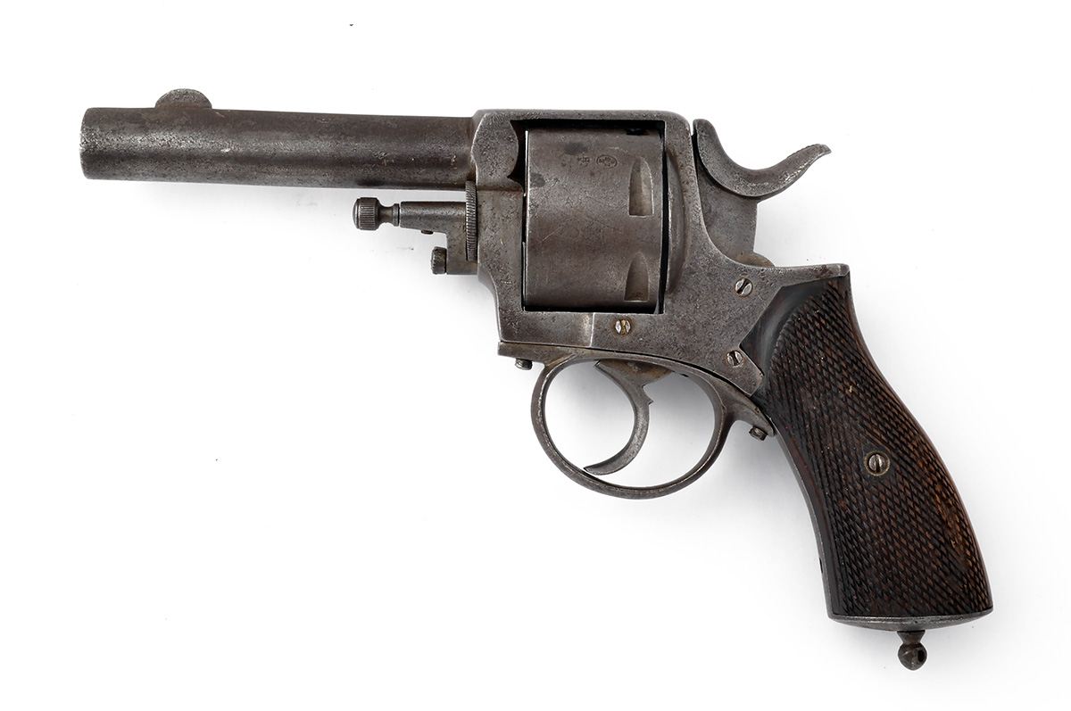 added later, Belgian manufacture with 4 1/8in. ovoid barrel, solid frame, plain cylinder and chequered wood grips, no finish