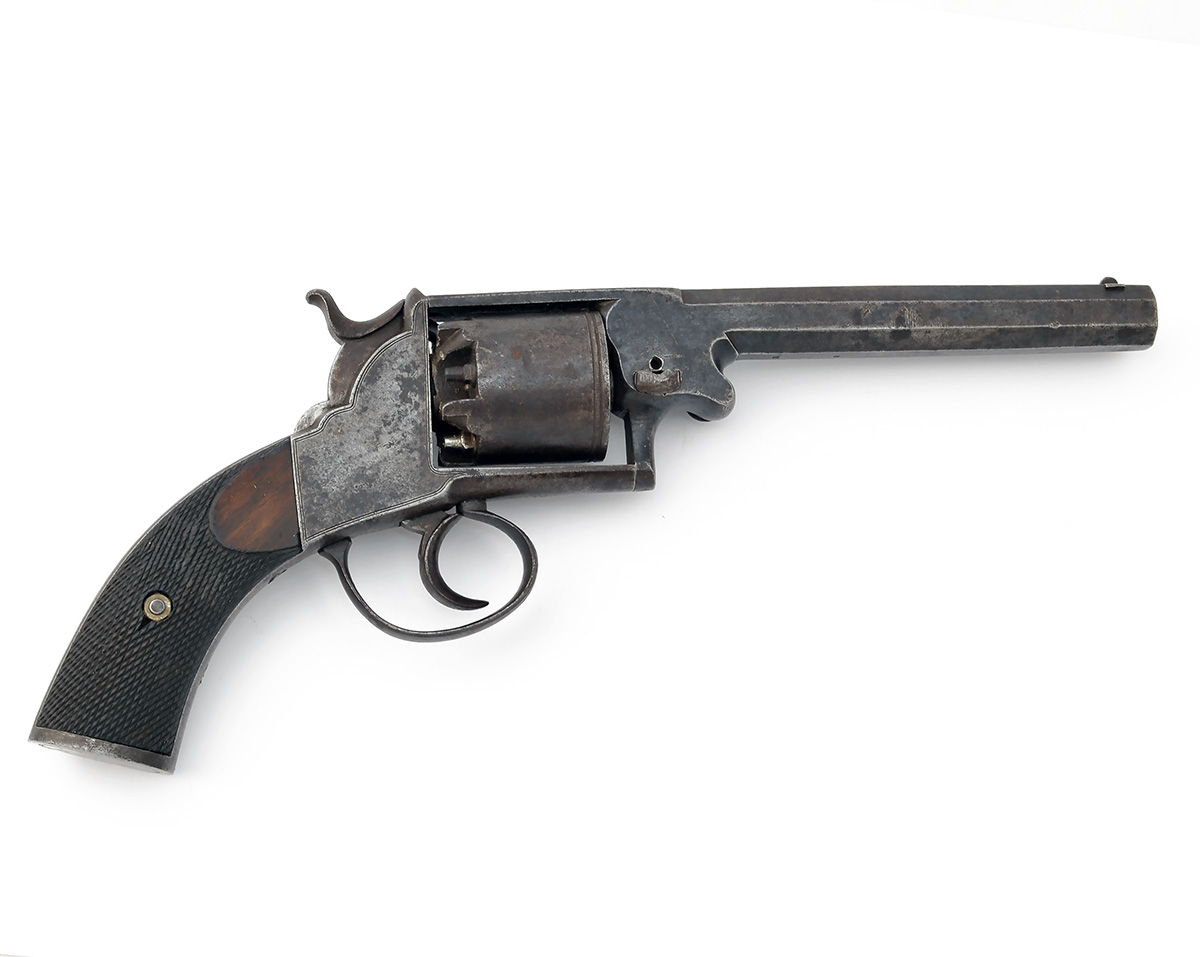 * A 54-BORE PERCUSSION DOUBLE-ACTION REVOLVER SIGNED BROOKS, LONDON, MODEL 'WEBLEY'S WEDGE-FRAME', serial no. W101317,