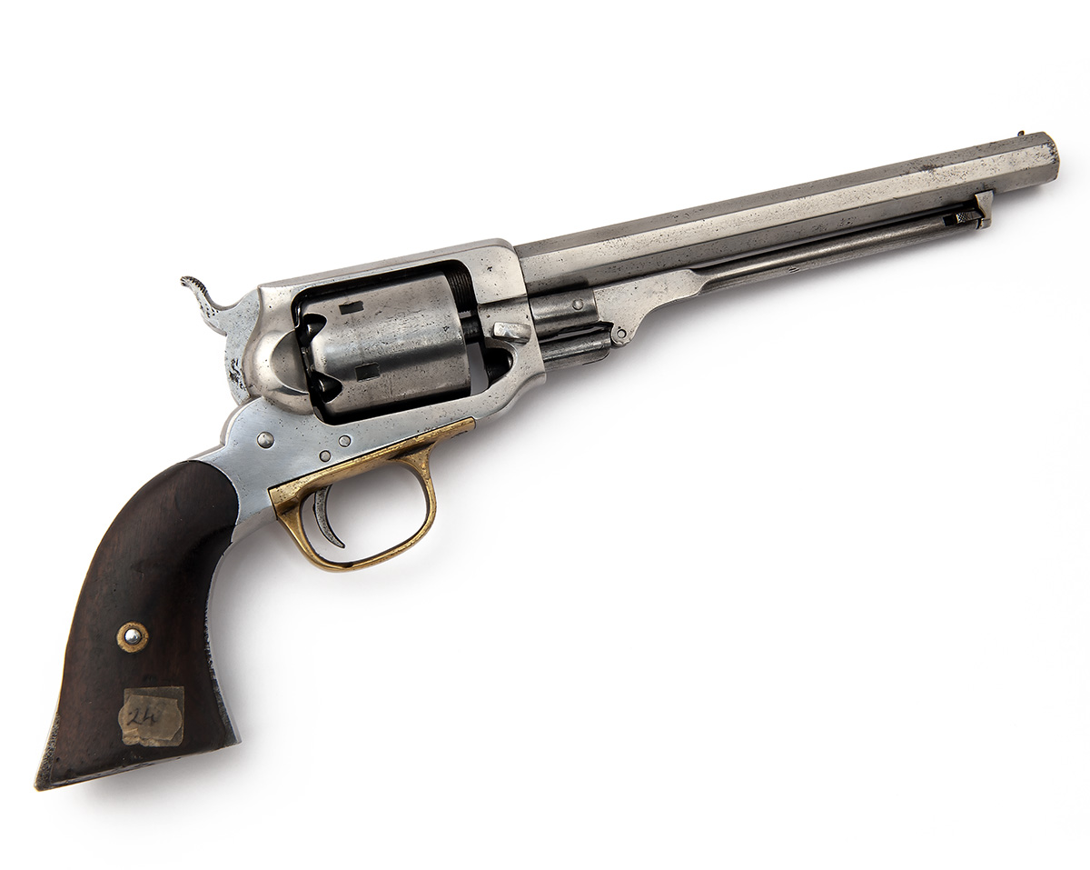 circa 1860, with brushed bright octagonal 7 1/2in. barrel signed on the top-flat near breech 'E. WHITNEY, NEW HAVEN', bead fore-sight, sighting groove to the top-strap, plain cylinder, solid frame, smooth walnut grips (small losses at heel), brass trigger-guard and articulated rammer with 'Colt' style catch and bearing both the serial number and the South African registration number 'W012447' on the inner face, the whole stripped of finish and in the white