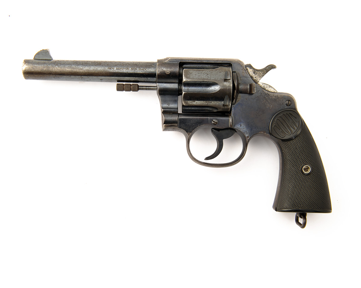 * A .455 SIX-SHOT SERVICE-REVOLVER SIGNED COLT, MODEL 'NEW SERVICE, serial no. 65973, for 1914, with blued 5 1/2in. barrel, blued fluted swing out cylinder, solid frame and chequered hard rubber grips (one chipped)
