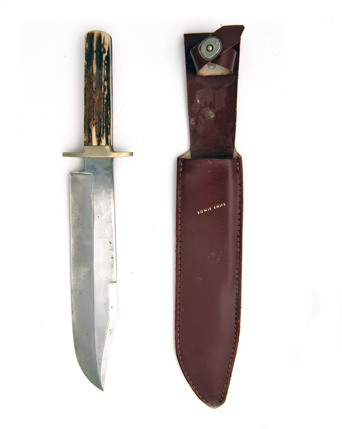 TWO LARGE STAGHORN HILTED BOWIE-KNIVES, ONE SIGNED R. & R. MIDDLETON, both with 9 3/4in. blades and leather scabbards (2)