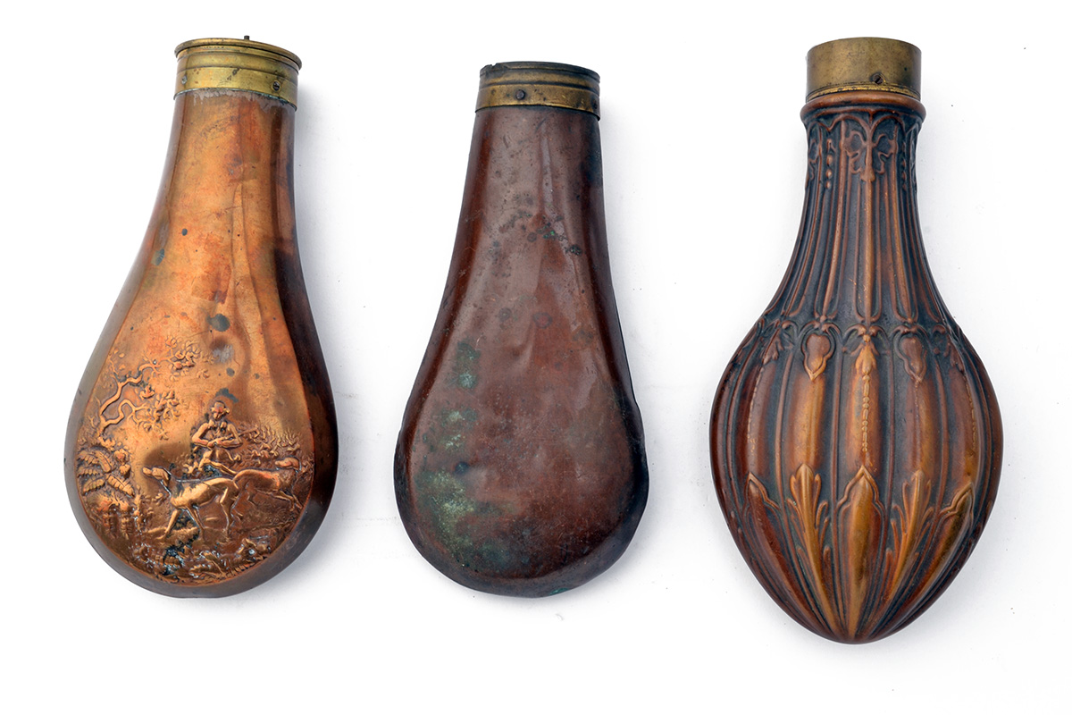 FIVE ASSORTED ENGLISH 19TH CENTURY POWDER-FLASKS FOR SPARES OR RESTORATION, (5)