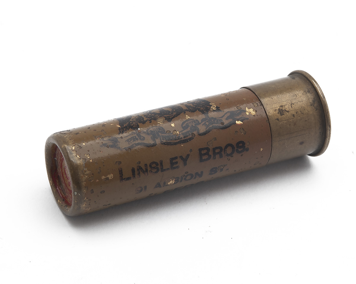 brass head stamped 'ELEY NOBEL', the body replicating a Linsley Bros. shotgun cartridge with the double owls crest, the '91 ALBION ST. LEEDS.', address and also 'WATER-RESISTING STEEL LINED' detail, the top of the case with imitation wad card 'LINSLEY BROS. LEEDS. 5'