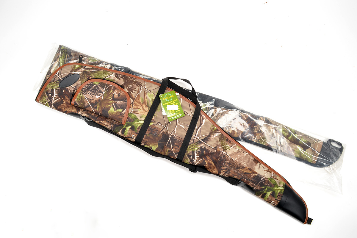† A COLLECTION OF NEW AND UNUSED SHOOTING ACCESSORIES, comprising of two camouflage APG fleece-lined rifle slips, a Ridgeline camouflage rucksack