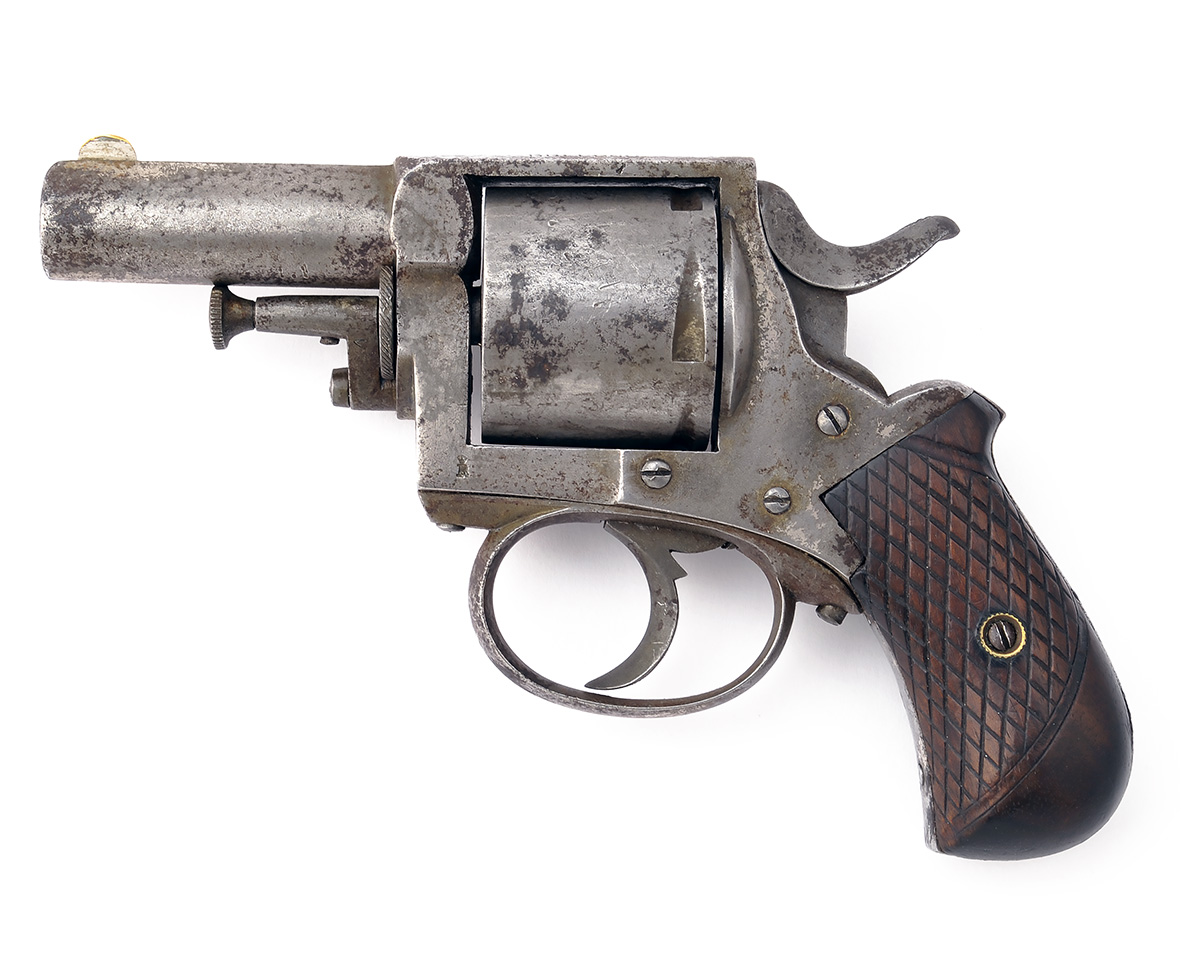 Belgian circa 1880 and of Webley type, with ovoid 2 1/2in. barrel, nickel crescent fore-sight, solid frame with sighting groove to the top-strap and marked 'BRITISH BULLDOG', plain cylinder, side loading gate, swing-out centrally mounted ejector and coarsely chequered walnut birdshead grips, traces of a plated finish