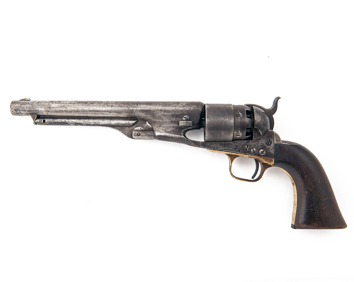 for 1861, with round 8in. barrel signed 'ADDRESS COL. SAML. COLT NEW-YORK U.S. AMERICA', applied nickel fore-sight, creeping under-barrel rammer, stepped cylinder (traces of scene), four screw iron frame with stock cut-out to the recoil shield and heel, brass trigger guard and front-strap, smooth walnut grip with traces of martial cartouche to left hand side, martial stamps, all matching numbers including wedge, finish worn