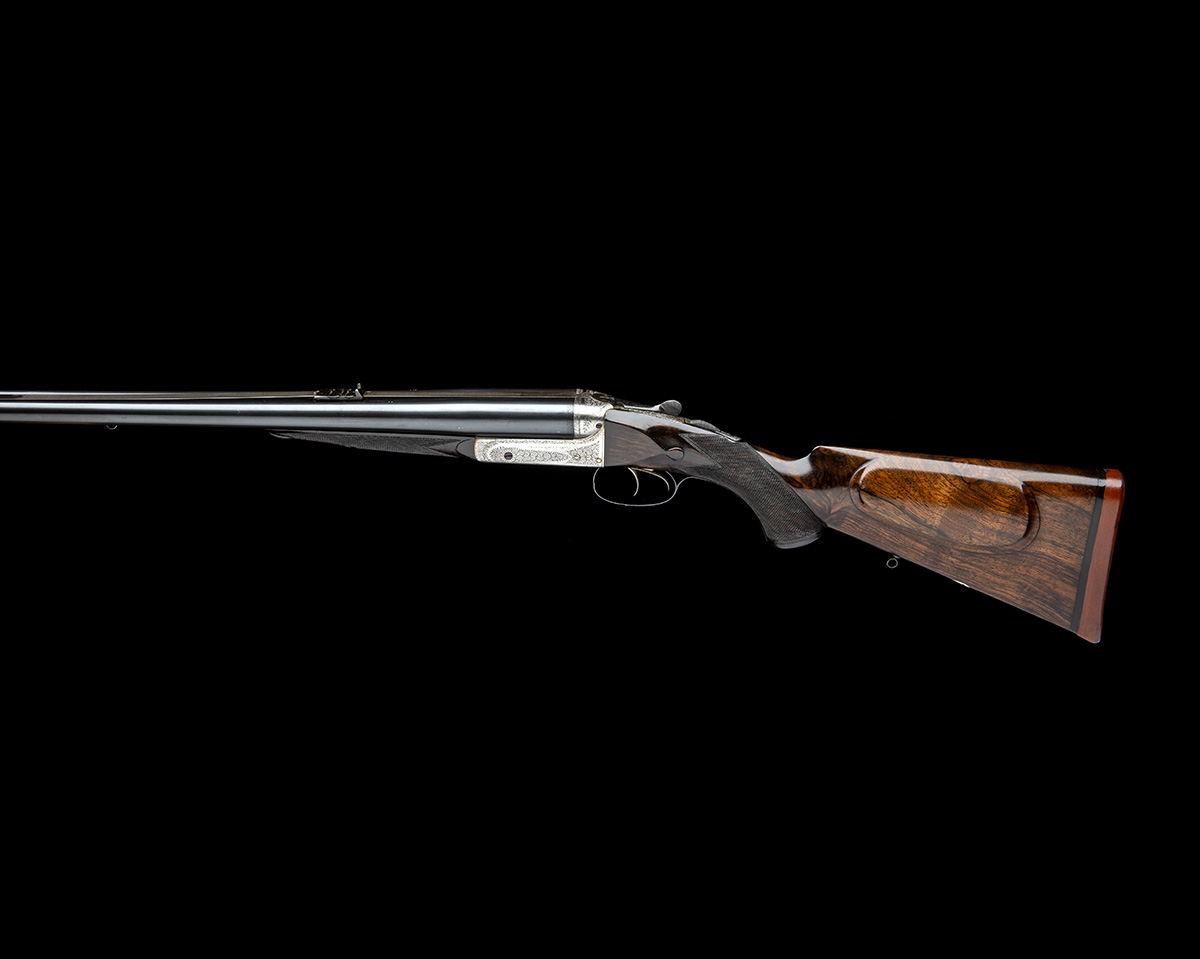 24in. nitro reproved chopperlump barrels (converted from .450 calibre and reproofed in 1977), raised file cut rib with open sights and two folding leaf sights, marked 100, 200 and 300 and with white metal sight lines, ramped bead fore-sight with flip-up moonsight, the tubes engraved 'JOSEPH LANG & SON. 102 NEW BOND STREET. LONDON. W.', and with cartridge information overstamped to reflect new status '.475 No.2 3 1/2" CASE', '85 GRS CORDITE 480GRS BULLET', treble-grip action, removable striker discs, intercepting sears, automatic safety with gold-inlaid 'SAFE' detail, fine acanthus scroll engraving with ornate stylised scroll bordering, brushed bright and reblued finish overall, 14 1/2in. well-figured pistolgrip stock (minor cracking at hand) with cheekpiece, pistolgrip-cap, sling eyes and including 7/8in. rubber recoil pad, bolstered fore-end with grip-catch release, weight 10lb. 6oz., in a relined brass-cornered oak and leather case