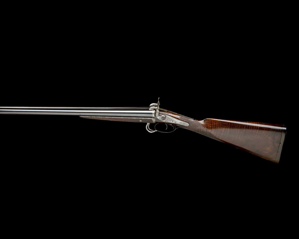 30in. blued (likely damascus) barrels, the rib engraved 'J. PURDEY 314 1/2 OXFORD STREET. LONDON.' (faint), Bastin slide-action system, the underlever of push-forward form, the lever hook with built up end section, slender carved serpentine pinfire fences, non-rebounding back-action locks, the large dolphin hammers with pinfire cartridge extraction apertures, one hammer screw a replacement, border and acanthus scroll engraving, the lockplates signed 'PURDEY', 15in. stock (possible replacement, chequering refreshed) including 1/2in. horn buttplate, weight 6lb. 13oz.