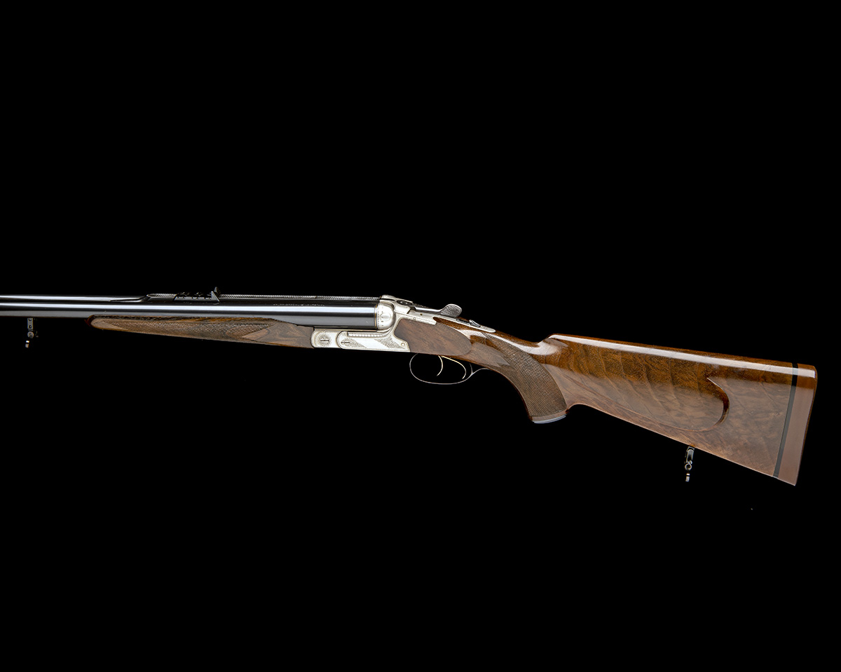 treble-grip action with side-bolsters, gold pin cocking-indicators, manual safety, articulated front trigger, partially engraved with acanthus scrollwork and bordering, bright and blued finish, 15in. figured pistolgrip stock with palm swell, cheekpiece, engraved steel pistolgrip-cap, sling swivels and including 1in. rubber recoil pad, weight 10lb. 2oz. (rifle barrels) and 7lb. 15oz. (shot barrels)
