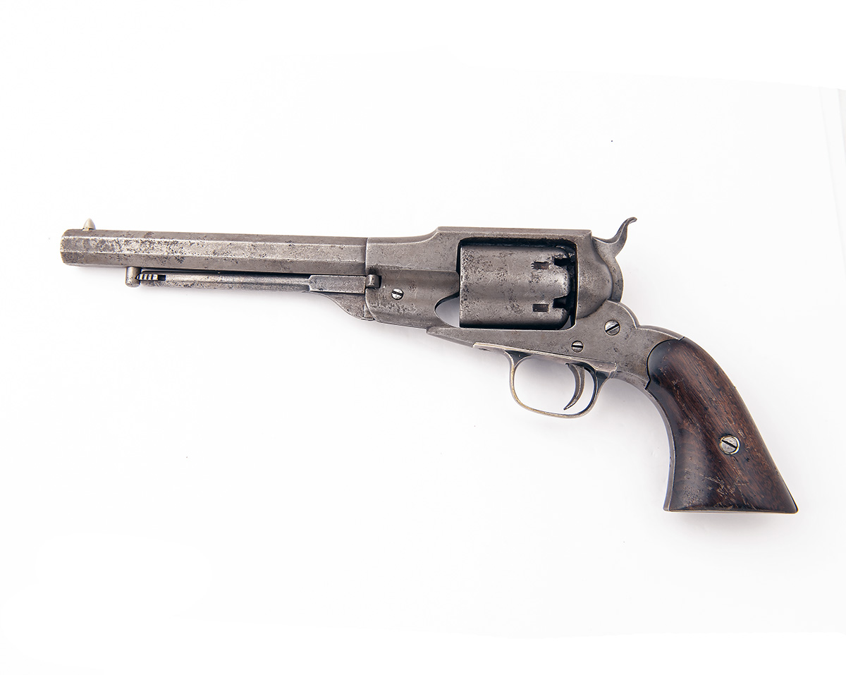 circa 1861-62, with octagonal 7 1/4in. barrel, the top-flat signed 'BEALS PATENT SEPT. 14 1858, MANUFACTURED BY REMINGTONS ILION, N.Y.', nickel fore-sight, concealed threads at barrel throat, sighting groove to the top-strap, solid iron frame, plain six-shot cylinder (some external pitting), single action mechanism with spurred hammer, smooth flared walnut grips and hinged under-barrel rammer, silver plated trigger-guard, the iron surfaces lacking finish