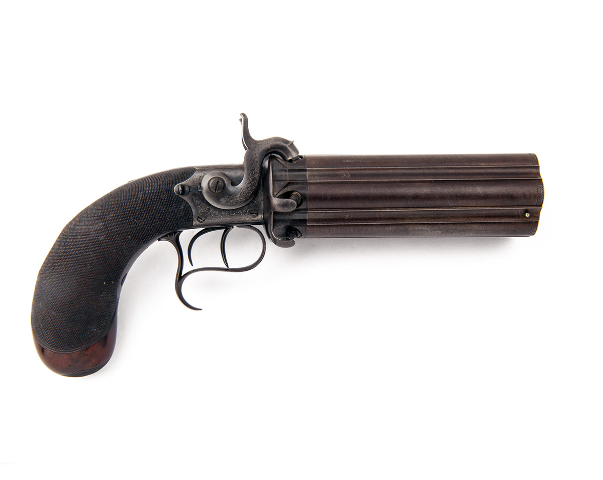 B. COGSWELL, LONDON AN EXCEPTIONALLY RARE 28-BORE PERCUSSION SIDE-BY-SIDE TRIPLE TURN-OVER PEPPERBOX PISTOL, no visible serial numbe...