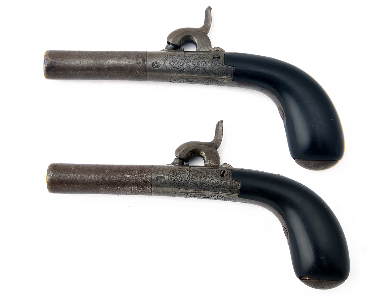 A PAIR OF 54-BORE PERCUSSION BOXLOCK MUFF-PISTOLS, UNSIGNED, no visible serial numbers,