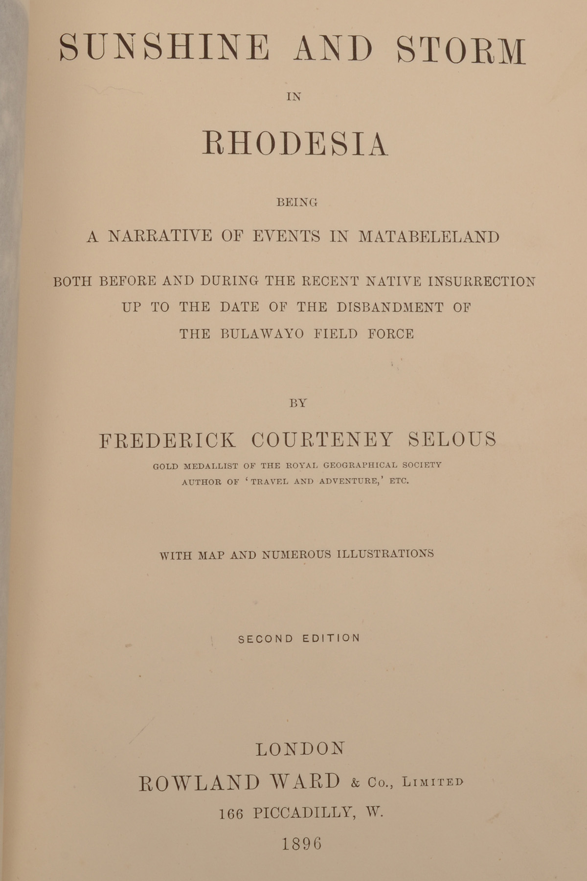a narrative of events in Matabeland, both before and during the recent insurrections up to the date of the disbandment of the Bulawayo Field Force, Rowland Ward & Co. Ltd. London. 1896 first edition, 290 pages, plates, maps, bound with beige cloth