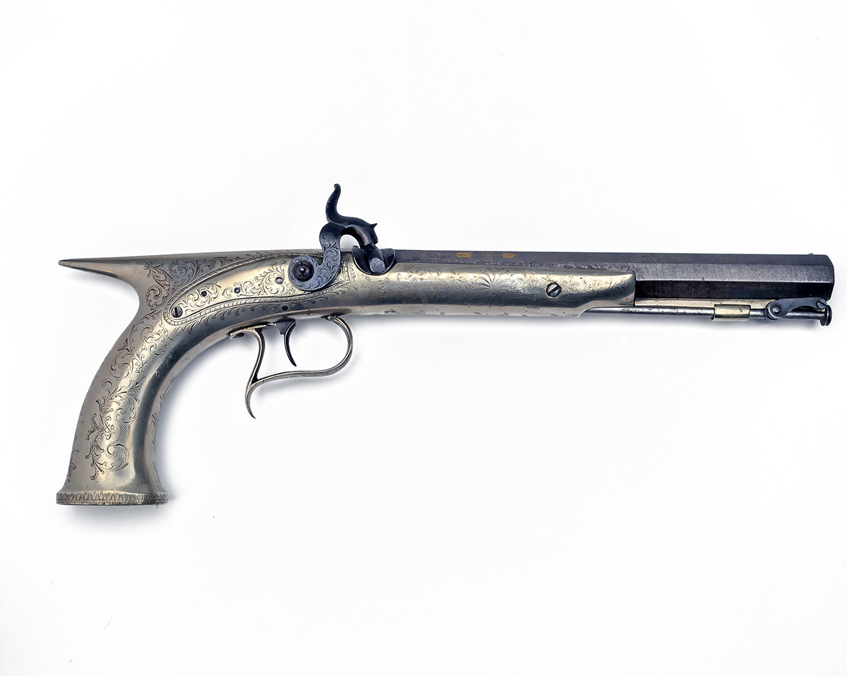 made for the American market circa 1860, with twist iron octagonal 8 1/4in. smoothbore barrel, the top-flat signed in gilt script 'LONDON' and flanked by gilt 'S' shaped scrolls with gilt running vines and flowers extending onto the top side-flats, engraved breech-block with carved fences for the nipple-boss, border and scroll engraved white metal back-action lock inlet into the white metal saw-handled half-stock, scroll engraved grip flaring at the flat heel and set with a small hinged trap, American eagle and shield engraved opposite the lock, spurred white-metal trigger guard bow, integral fore-end engraved with floral motifs and captive iron stirrup ramrod, complete with its oak storage case, lined and compartmented for this pistol in green baize (label removed) and containing a reproduction flask together with an original scissors mould, loading rod, nipple key, patch and cap-tins