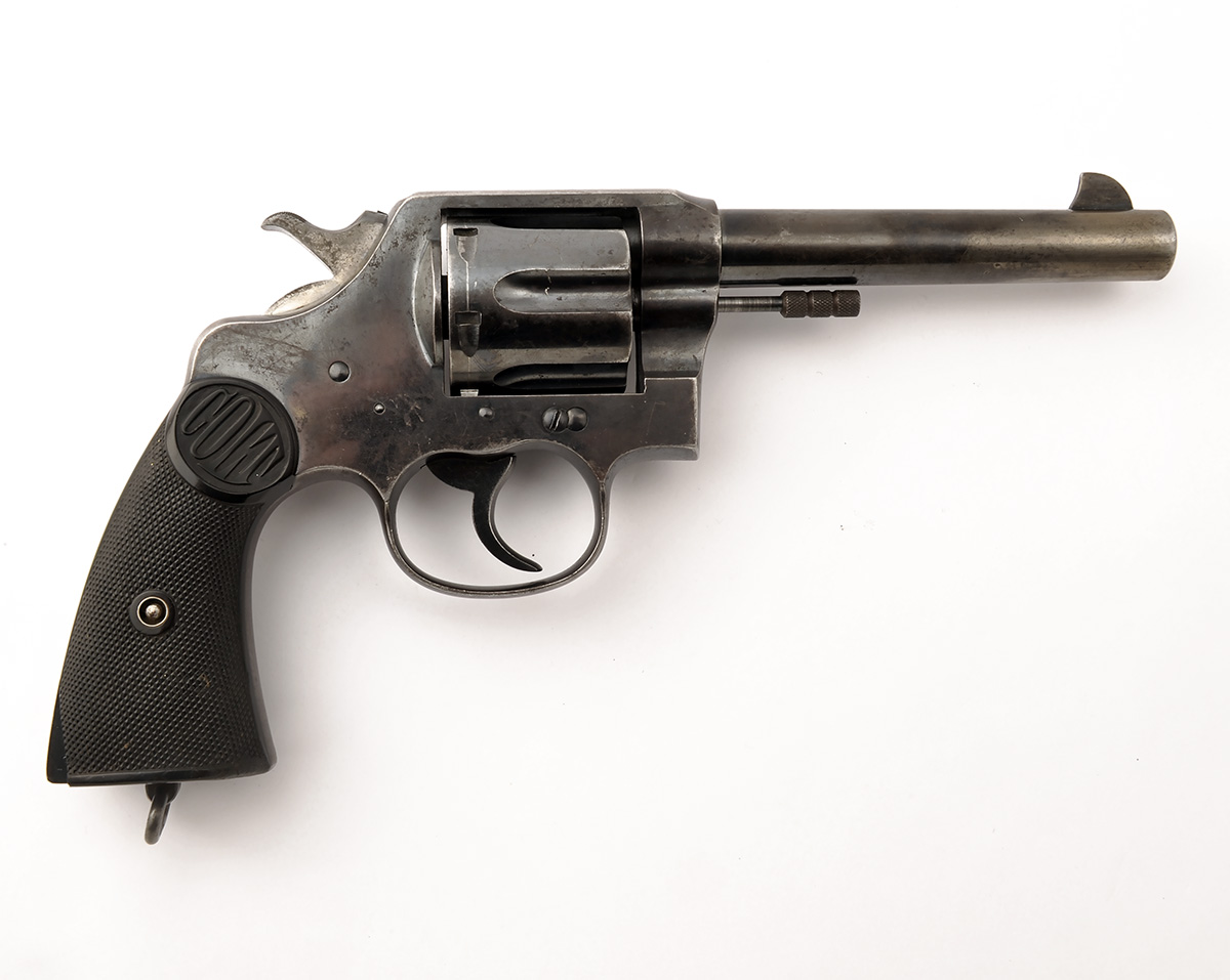 A .455 SIX-SHOT SERVICE REVOLVER SIGNED COLT, MODEL 'NEW SERVICE', serial no. 99592, for 1916, with 5 1/2in. barrel, swing out fluted cylinder, solid frame and chequered hard rubber grips, some loss to finish, one grip chipped