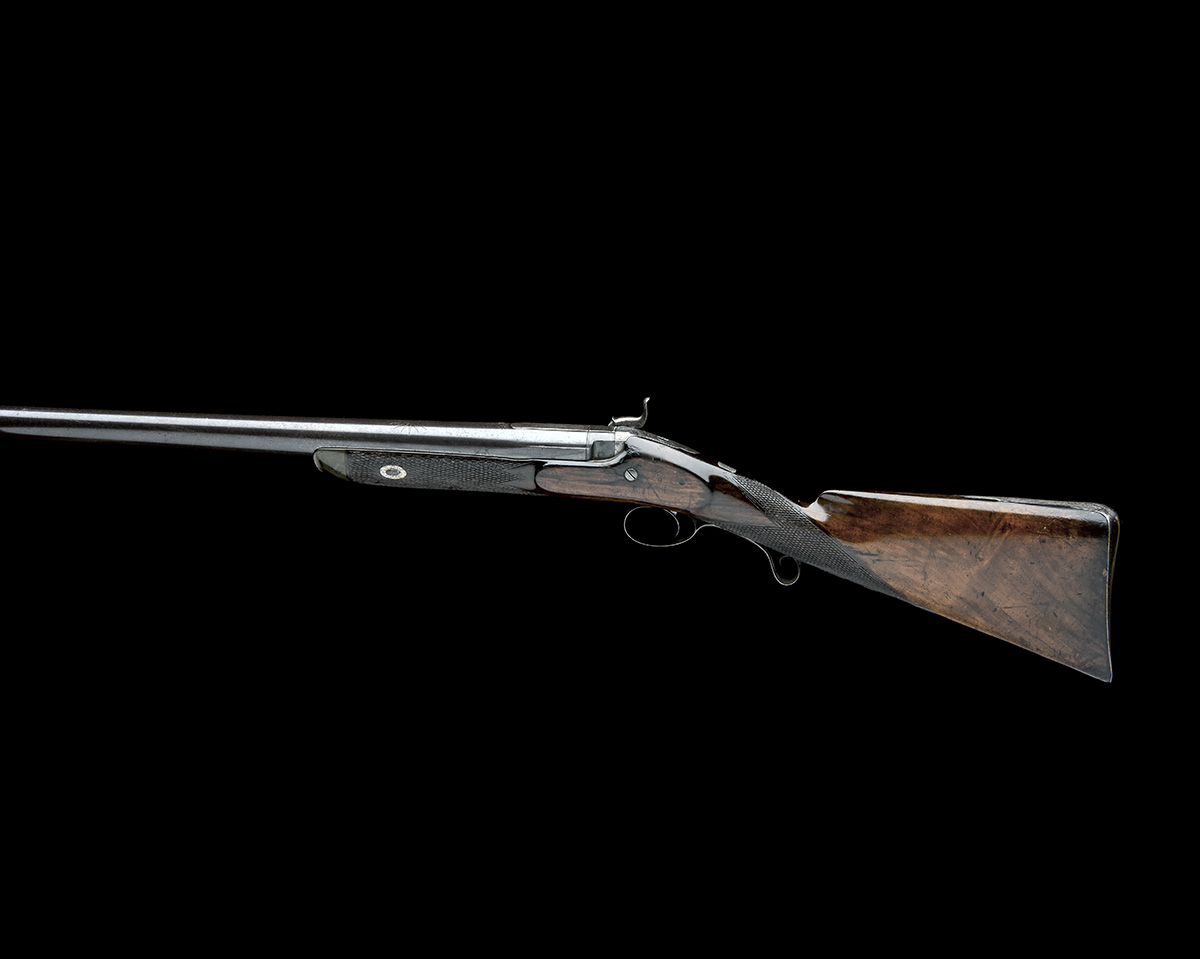 circa 1865, with shortened 27 3/4in. browned barrel, bead fore-sight, short sighting rib at breech signed 'LONDON' (rubbed) and engraved with a borderline and scroll border with an engraved needle to the front terminating in a starburst, moulded short side-flats, the top of breech engraved with a dog's head holding a dead gamebird, platinum line and vented plug, borderline and scroll engraved top-tang, border and scroll engraved bar-action lock signed 'J. WILLIAMS', chequered walnut half-stock, iron furniture including raised and scrolled chequered lower tang and no provision for ramrod
