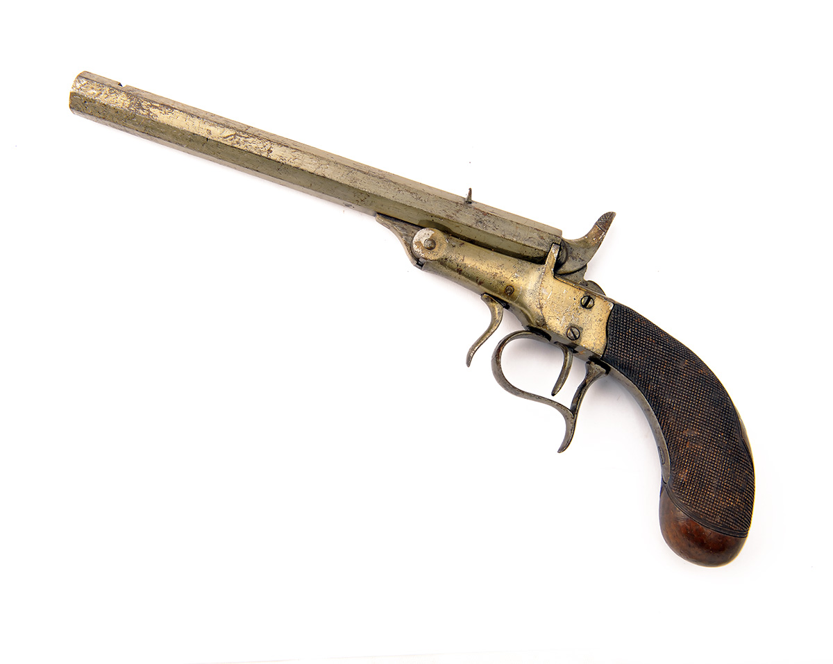 A .22 (FLOBERT) SINGLE-SHOT SMOOTHBORE PISTOL, UNSIGNED, no visible serial number, with 0octagonal 7 3/4in. barrel, tilt-down action with trigger release, central hammer and chequered walnut bag-shaped butt, stripped of finish and varnished