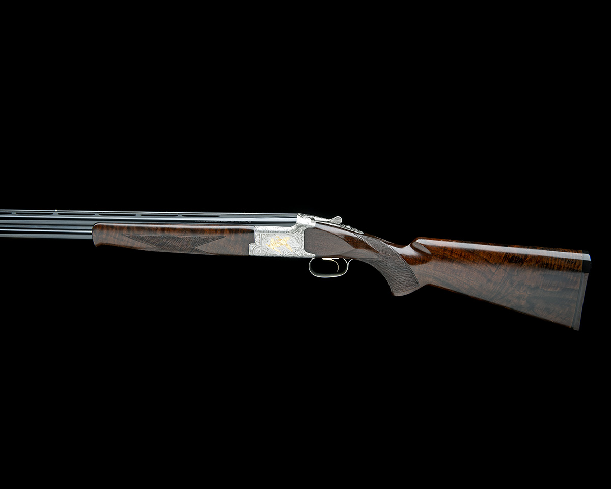 30in. nitro reproved barrels with 14mm ventilated matt top-rib, 2 3/4in. chambers, multichokes (with spares), hold-open toplevers, manual safety with integral barrel selector switch, adjustable gold-washed trigger, bold acanthus scroll engraving surrounding gold-inlaid game scenes of pheasant, duck, pointer and partridge, bright finish, 15in. figured pistolgrip stock including 3/8in. rubber recoil pad, weight 7lb. 10oz.