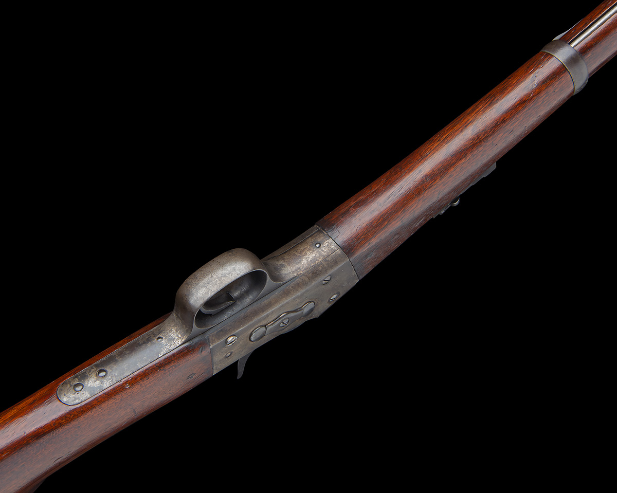 circa 1875, with blued 35 1/2in. barrel, dove-tailed blade fore-sight on a raised block, elevating ladder rear-sight, slab-sided rolling-block action (traces of colour), makers address details to the top-tang, walnut butt-stock and three-quarter length fore-end, iron furniture including three barrel-bands, under-barrel clearing rod and side bayonet bar