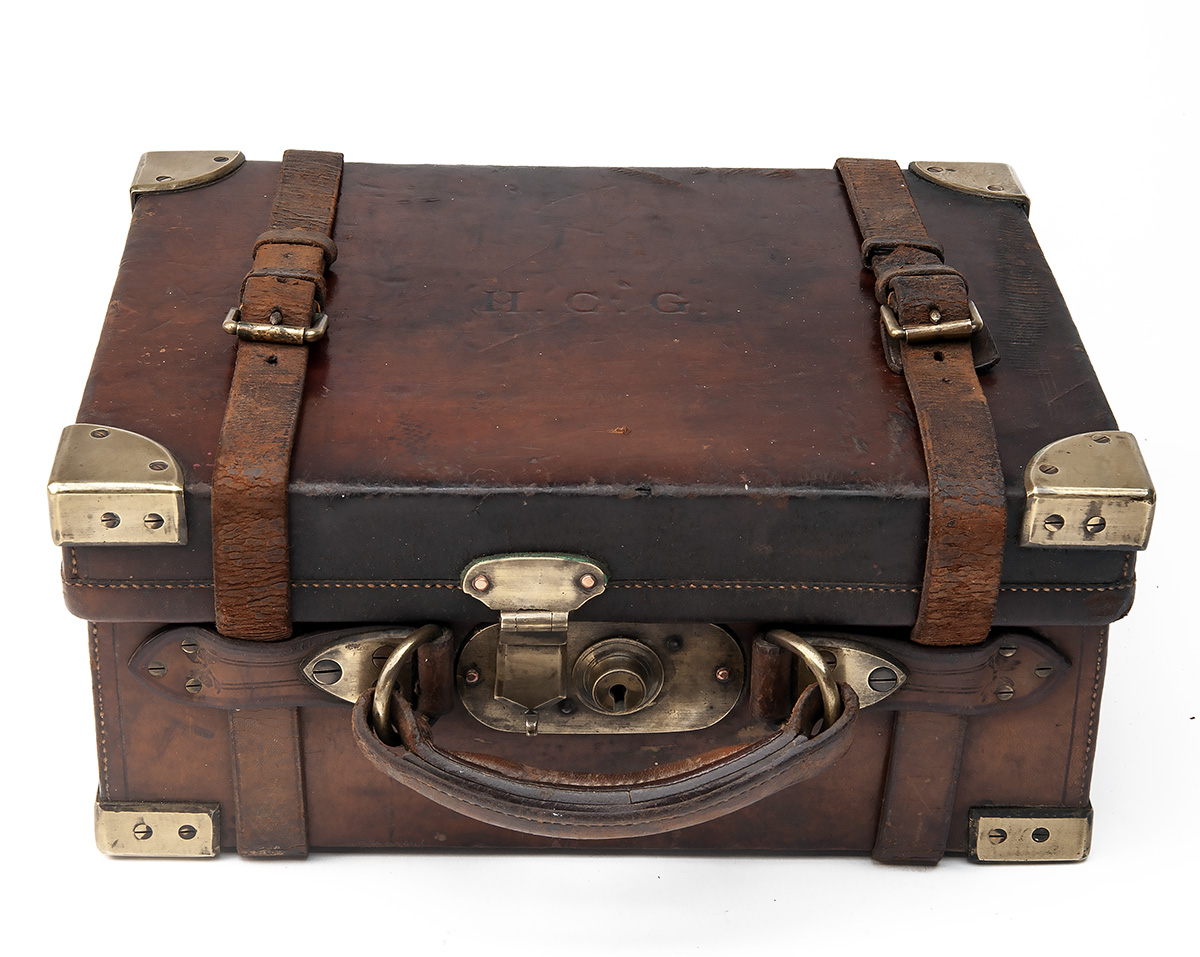 COGSWELL & HARRISON LTD. A BRASS-CORNERED OAK AND LEATHER CARTRIDGE MAGAZINE,