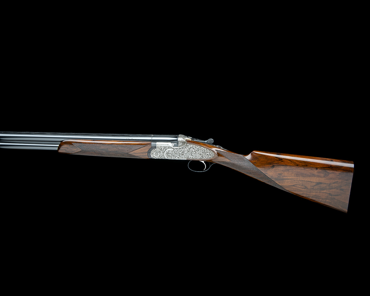 26 3/4in. nitro barrels with 8mm ventilated matt top-rib, 2 3/4in. chambers, bored approx. 1/4 and 3/4 choke, hold-open toplever, automatic safety with integral barrel selector switch, the action, lockplates and furniture engraved with floral scrollwork set against a matt background, 14 1/2in. stock, weight 7lb. 3oz.