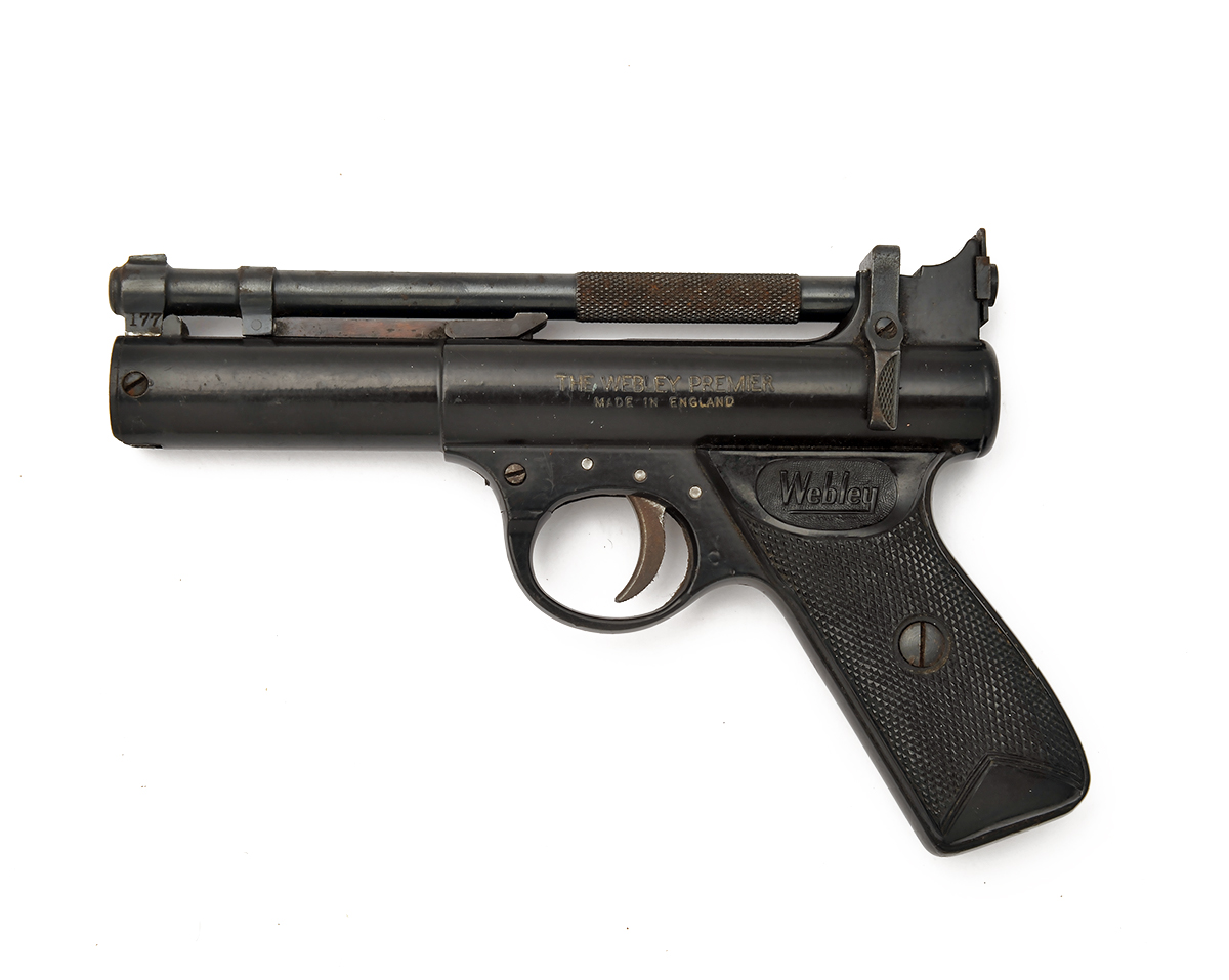 A .177 BARREL-COCKING AIR-PISTOL SIGNED WEBLEY & SCOTT, MODEL PREMIER, batch no. 205, with blued 6 5/8in. barrel, stirrup barrel latch, stove-enamelled finish and chequered black plastic grips,much finish remaining