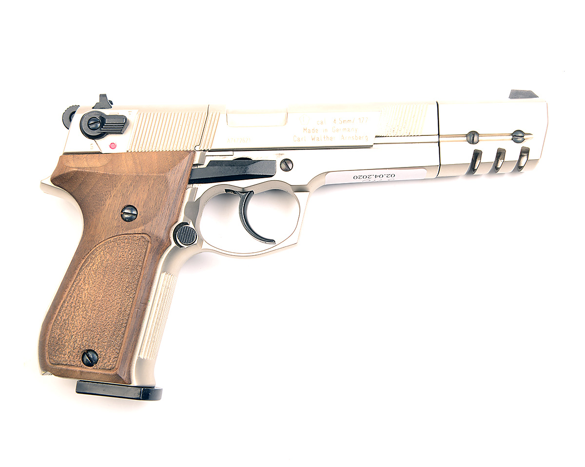 A CASED .177 CO2-POWERED AIR-PISTOL SIGNED WALTHER, MODEL 'CP88 COMPETITION', serial no. A7472621, with 6in. barrel with muzzle weight, electroless nickel plated finish, stippled walnut grips and complete with its makers abs plastic case and four magazines, tested