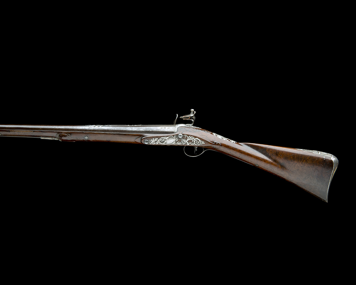 apparently a collaboration, London hallmarked for 1746, with swamped and browned 30in. barrel, the short raised sighting plane at breech relief carved with shells, tulips and borders terminating in a carved floral flourish and signed 'E, COOMBS, BATH', applied tear-drop silver fore-sight carved with a mask, engraved band and London proofs at breech together with the maker's stamp 'E.C.' below a star, gold lined touch-hole, engraved iron top-tang with moulded sighting groove and fixed with a special square socketed screw, flat bevel-edged lock with stepped and pointed tail and engraved with a banner below the gold-lined bridled pan 'THWAITS, BATH', the frizzen with special swan-necked articulated lever attached to the foot operating on a specially shaped spring, walnut handrail banana full-stock with florally carved apron around the top-tang, complex silver rococo escutcheon to wrist, large silver heel-plate fixed with special screws and struck with large hallmarks, the top-spur moulded in relief with floral swags and borders and engraved with a musical trophy, hallmarked trigger-guard bow and tang, the bow moulded with a shell in relief, the finial also formed from two carved silver shells, carved bulbous section around the silver ramrod throat, two further silver pipes and original horn ramrod with silver tip and worm end, complete with its W. Keith Neal collection medallion numbered 'G461'