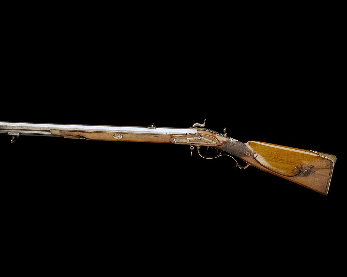 circa 1770 with later conversion to percussion, in the white 31 1/2in. swamped octagonal barrel, dove-tailed fore-sight, elevating drift adjustable rear-sightflorally engraved snail to the breech-block with integral top-tang, flat border engraved lock of flint form with pointed tail, walnut half-stock with chequered panel at wrist also bearing a nickel shield-shaped escutcheon marked 'H.B. 1845' (possibly the date of conversion), carved raised cheek-piece with carved floral detail, brass furniture including engraved and moulded heel-plate, raised lower tang with broad engraved trigger guard bow, pierced ribbon sideplate, ramrod throat and nose=cap, double set triggers, iron swivels and replacement brass tipped ramrod