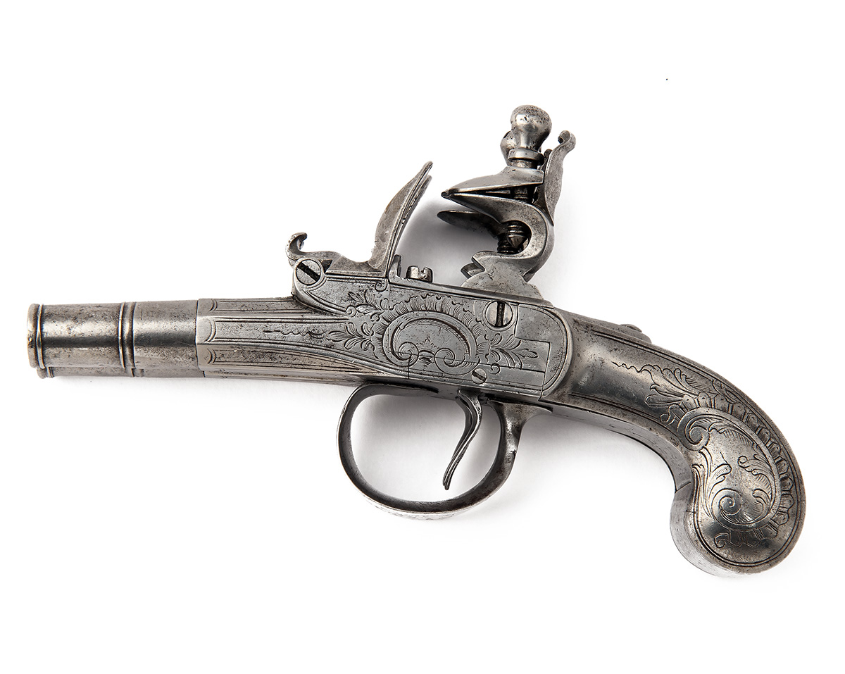 A 140-BORE FLINTLOCK DOUBLE-BARRELLED ALL-STEEL SIDE-BY-SIDE POCKET-PISTOL SIGNED LONDON, no visible serial number,