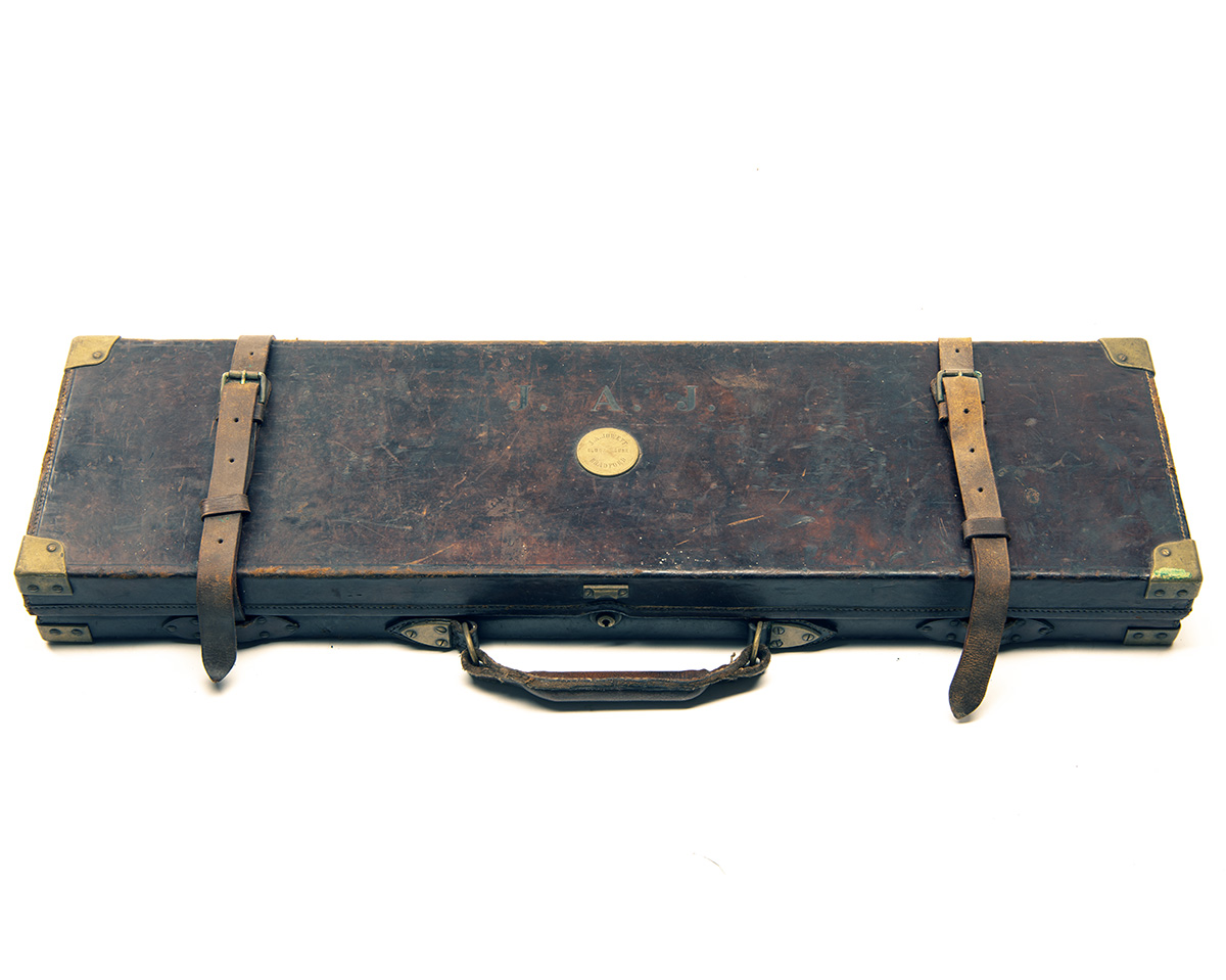 fitted for 30in. barrels, the interior lined with red baize, a Cogswell & Harrison trade label, brass push-button lock (key missing), the lid exterior with a central brass escutcheon with 'J.A. JAWETT CLOCK HOUSE BRADFORD'