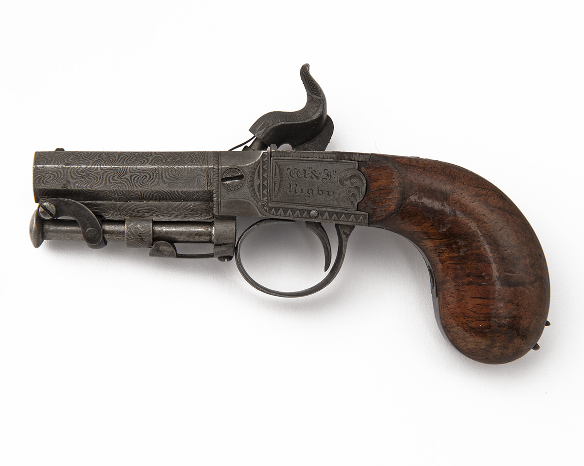 circa 1824, with etched damascus octagonal 2in. barrel, the top-flat with small fore-sight and signed 'DUBLIN', side-mounted nipple-boss with vented platinum plug and spring cap retainer, border and scroll engraved squared boxlock action with en-suite side-hammer, the left side of action signed in a panel 'W & J RIGBY', smooth walnut butt of Irish form, the back-strap hinging upwards to reveal apertures for caps and balls, guarded trigger and captive iron ramrod with concealed worm end