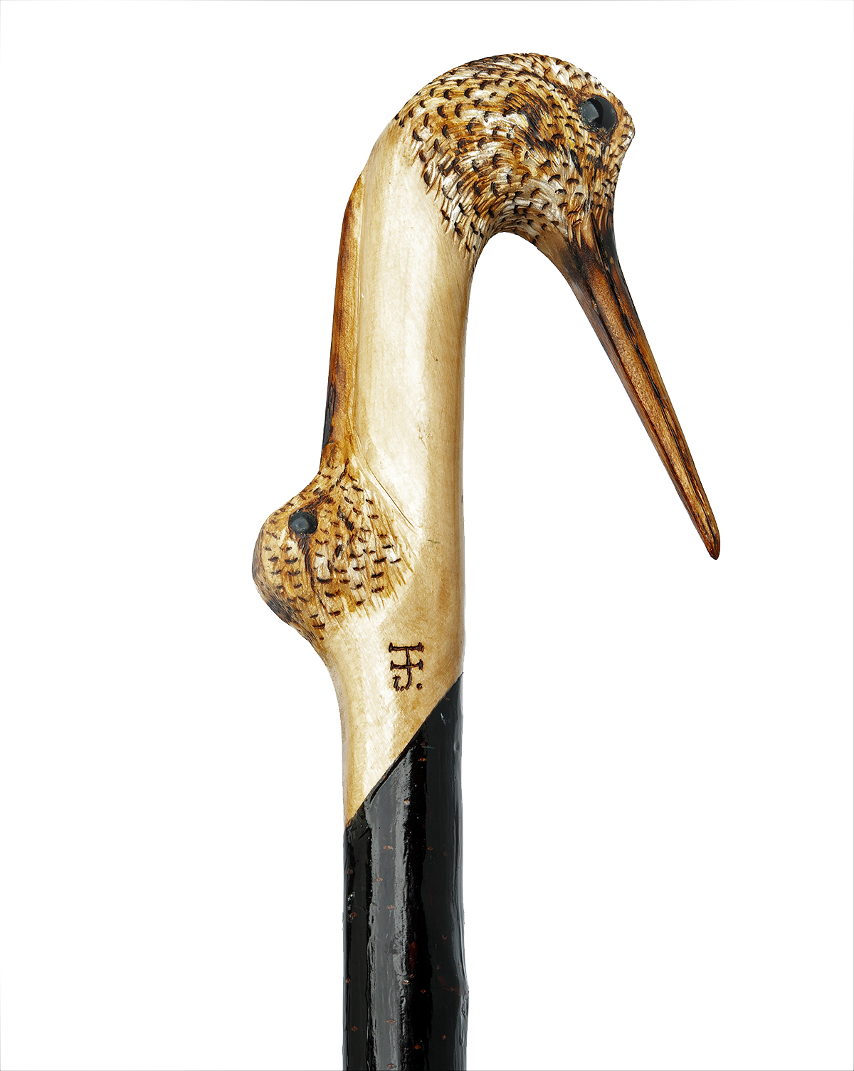 measuring approx. 50in. in length, with hand carved top in the form of a woodcock, the neck with another head of a woodcock, with magnetic cartridge ferrule