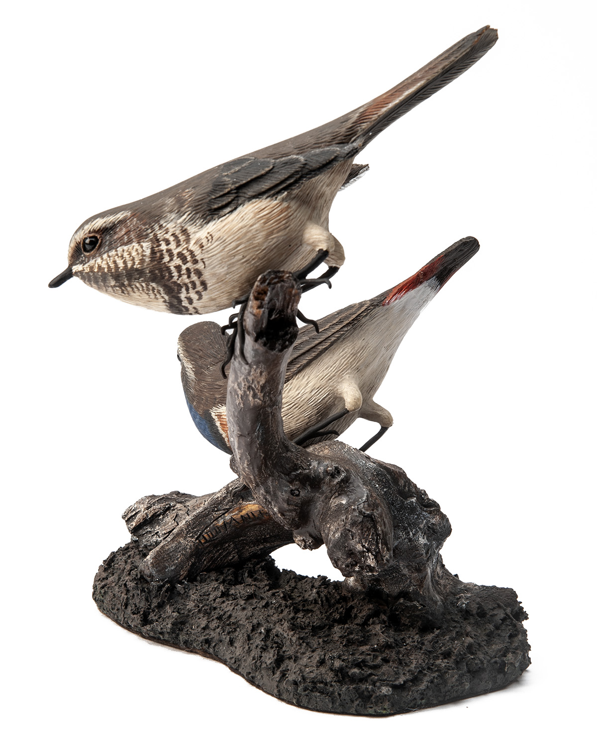 A FINE HAND-CARVING OF A PAIR OF BLUETHROATS,