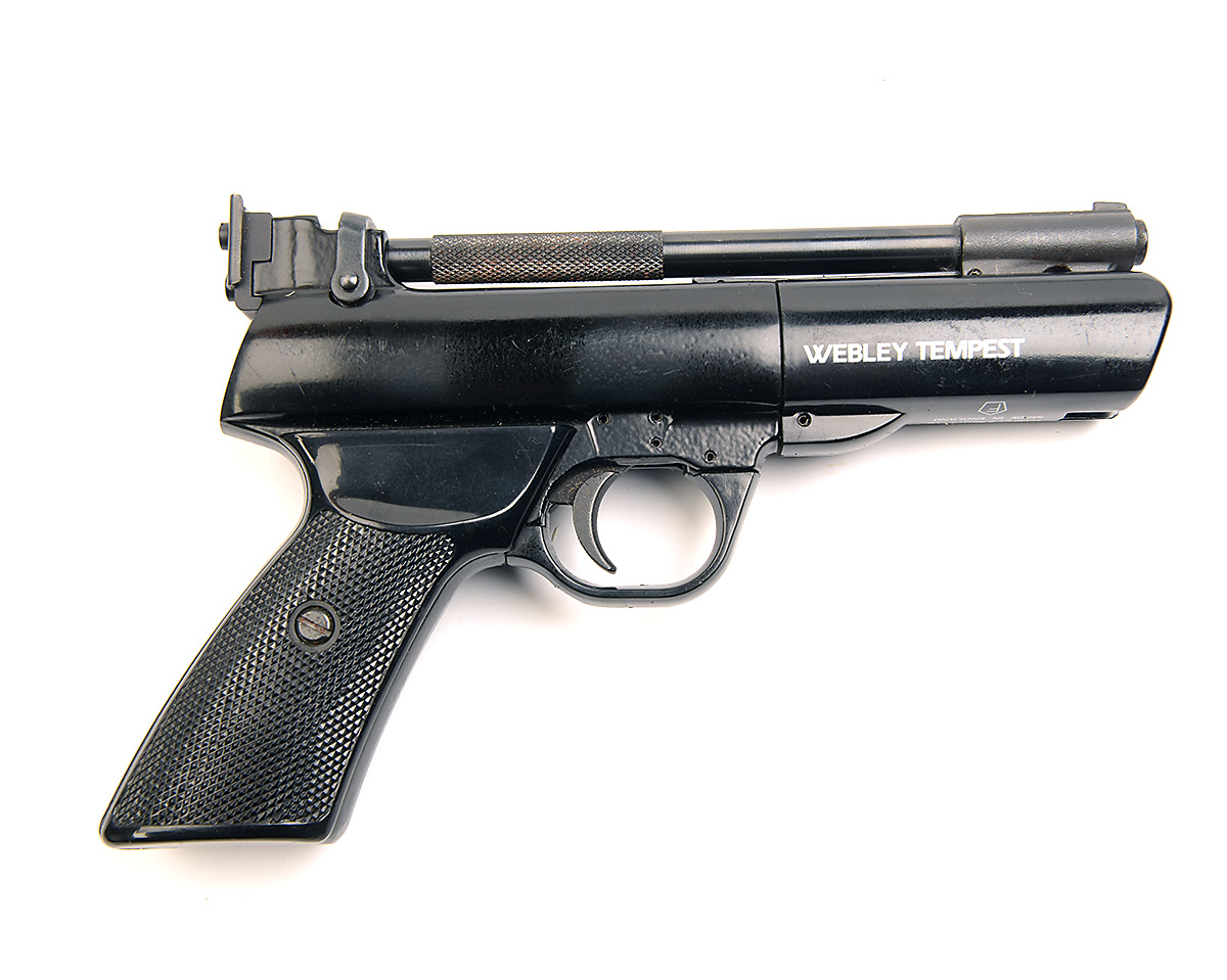 A CASED .22 BARREL-COCKING AIR-PISTOL SIGNED WEBLEY & SCOTT, MODEL 'TEMPEST', no visible serial number, with 6 7/8in. barrel, adjustable rear-sight, alloy air-chamber with black plastic furniture and black plastic chequered grips, in an 'MTM' caseguard case, appearing little used