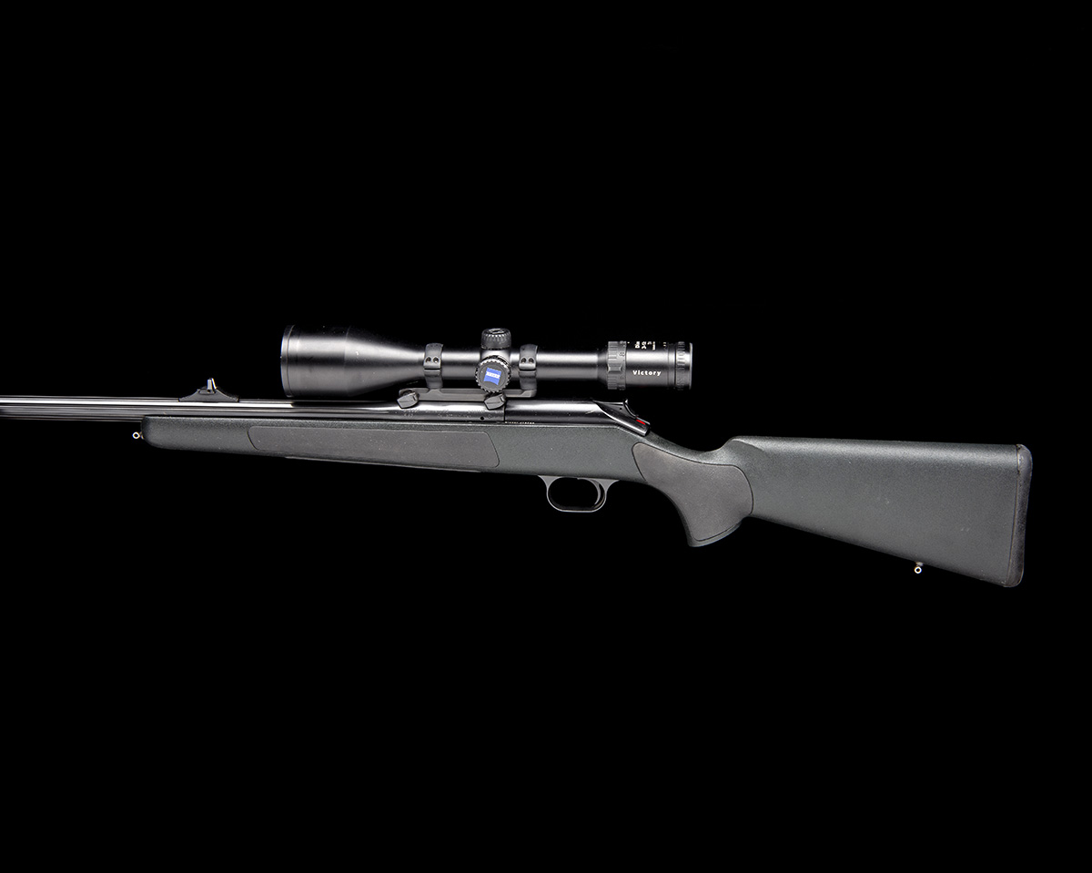 25in. fluted nitro barrel, serial numbered 9/183127, with block-mounted open sights and ramp-mounted high visibility bead fore-sight, the breech end mounted with a Zeiss Diavari 3-12x56 T* Victory telescopic sight, serial number 3184878, on a Blaser quickly-detachable mount rail, dark green synthetic stock with rubber grip inserts and internal recoil reducer, sling eyes, 14 1/4in. pull including 1/2in. rubber recoil pad, weight 8lb. 7oz. (unscoped) and 10lb. 2oz. (with scope), the bolt with a Napier canvas pouch, the whole in a Peli 1700 protective case
