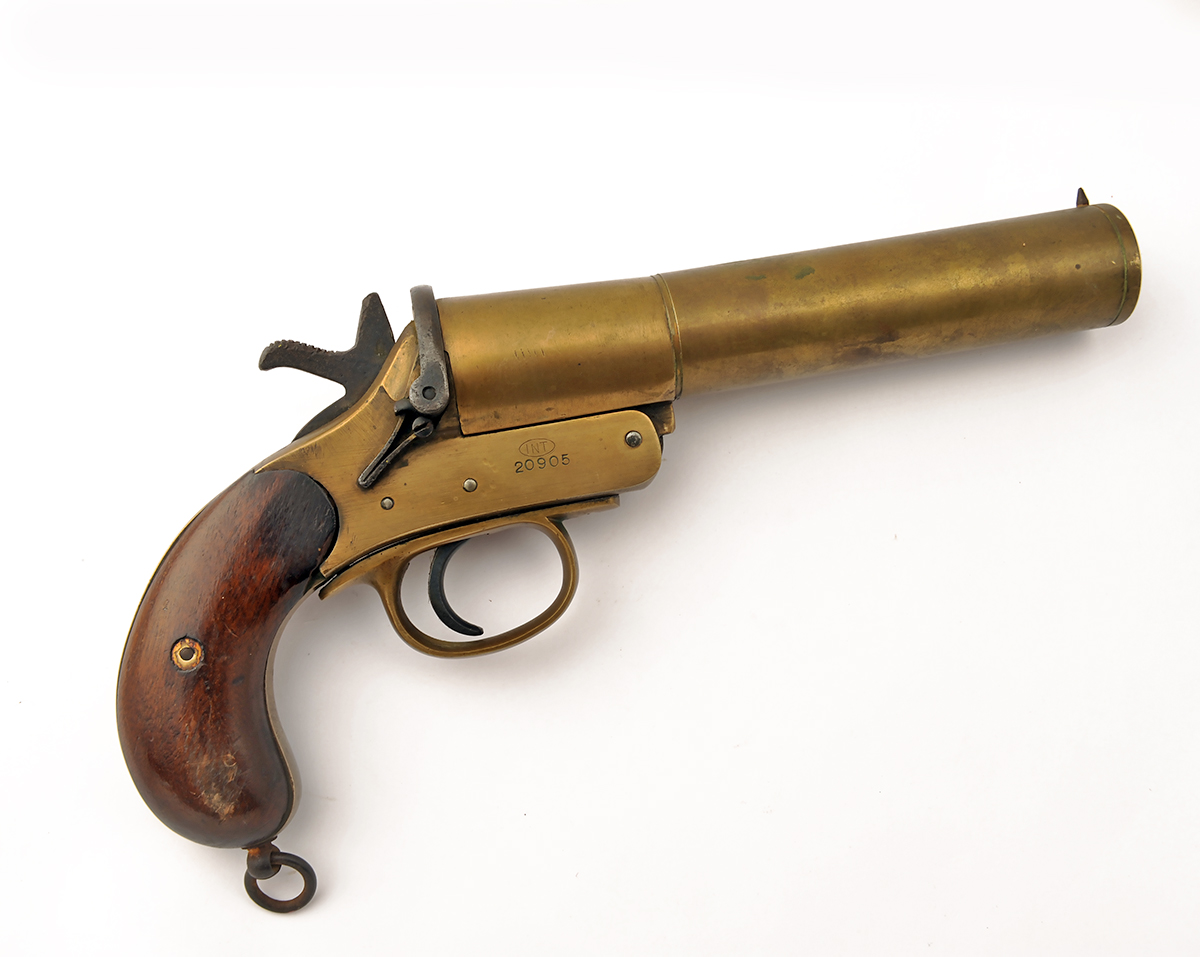 A 1inch BRASS SIGNAL-PISTOL SIGNED 'INT', serial no. 20905, circa World war One, with 7 1/2in. barrel extended by an outer brass sleeve, Schermuly type action with stirrup locking catch and walnut bag-shaped grips