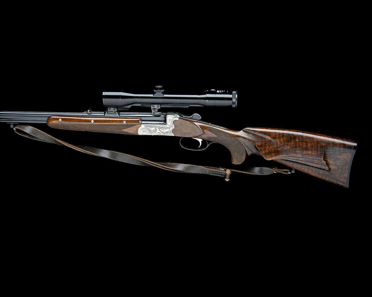 23 3/4in. nitro barrels with stepped solid matt top rib, signed 'G. JUCH', open sights and ramped bead fore-sight, the breech end mounted with a Zeiss Diavari-Z 1,5...6x42 T* telescopic sight, serial no. 1915580, in quickly-detachable mounts, three-piece fore-end with wooden side fillets, quadruple-grip scroll-back alloy action with side-bolsters, manual safety, game and scroll engraving, bright finish, 14 1/2in. birds head pistolgrip stock with sculpted cheekpiece, sling swivels and buttplate, weight 7lb. 7oz. (unscoped) and 8lb. 14oz. (with scope)