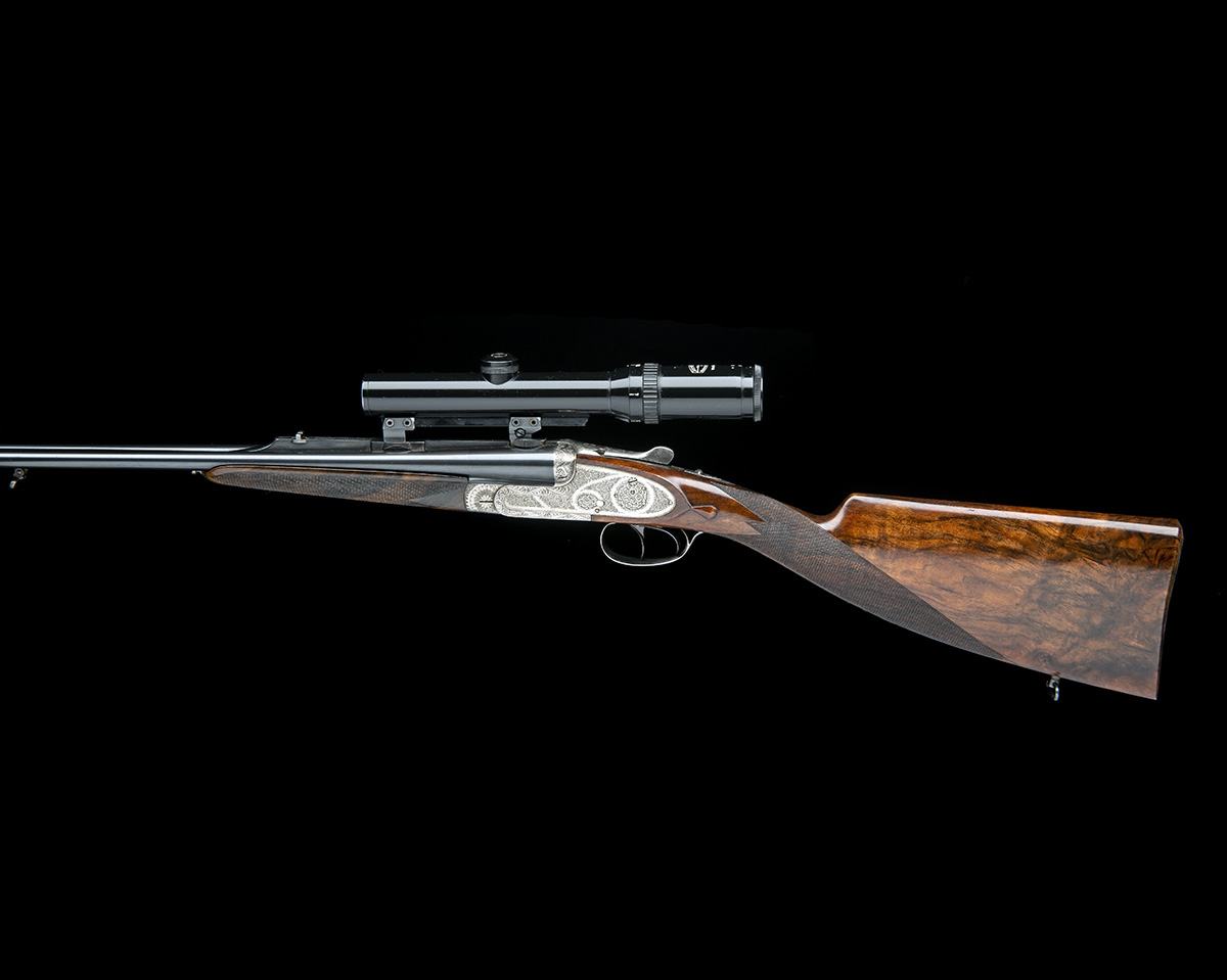 28in. nitro 20-bore shot barrels with raised file cut rib (some recent over existing name banner), 3in. chambers, bored approx. 1/4 and 1/2 choke, some internal pitting, shared fore-end, unsigned action with removable striker discs, manual safety, gold-inlaid cocking-indicators, articulated front trigger, rolled-edge triggerguard, fine acanthus scroll engraving with floral bouquets, bright finish, 14in. well-figured roachbelly stock with sling swivels, weight 7lb. 5oz. (rifle barrels, unscoped), 8lb. 6oz. (rifle barrels with scope) and 6lb. 7oz. (shot barrels), in a wood case with burr walnut effect finish and a cloth outer cover, provision for one set of barrels (not provisioned for telescopic sight)