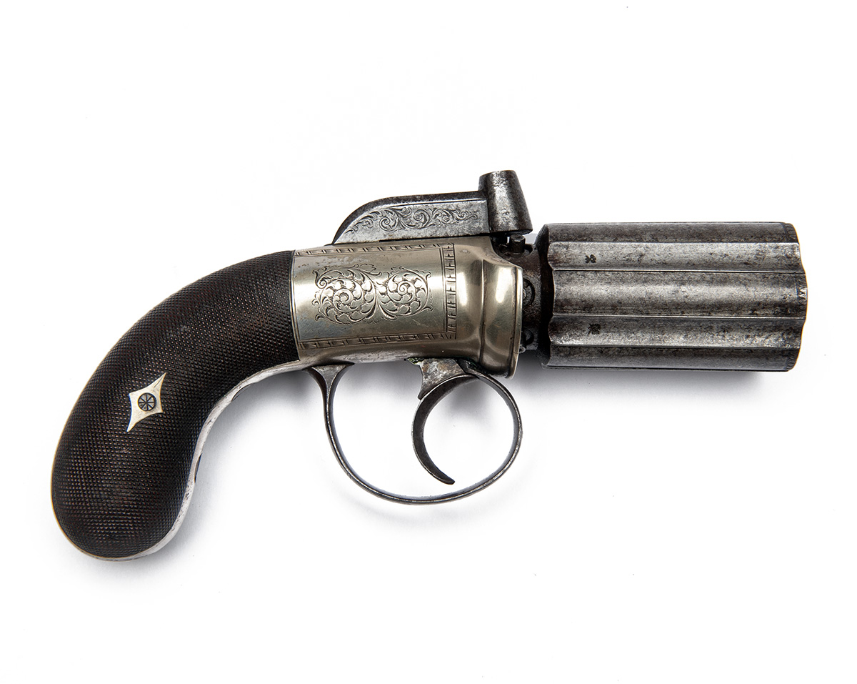 A CASED 80-BORE PERCUSSION PEPPERBOX REVOLVER WITH WHITE-METAL FRAME, no visible serial number,