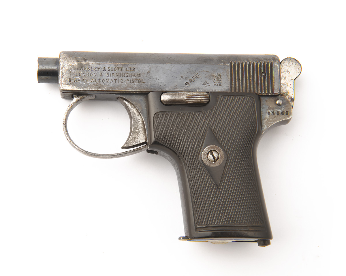 A .25 (ACP) SEMI-AUTOMATIC POCKET-PISTOL SIGNED WEBLEY & SCOTT, MODEL 1907 HAMMER POCKET', serial no. 54668, with 2in. barrel, unsighted slide, blued frame and chequered hard rubber grips