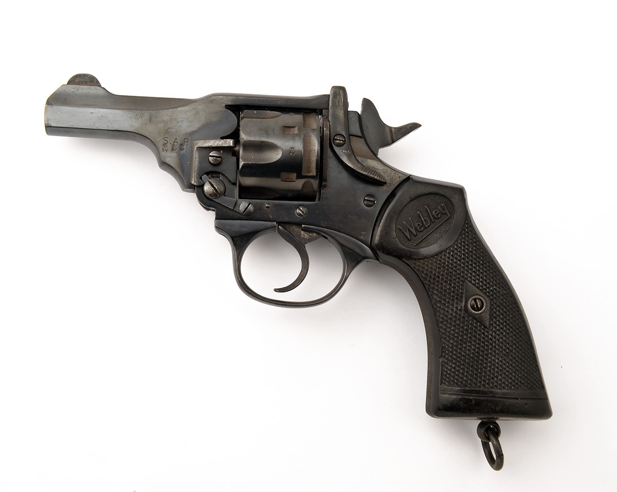 A .38 (S&W) REVOLVER SIGNED WEBLEY & SCOTT, MODEL 'MKIV', serial no. A9490, with blued 3in. barrel, break open frame, auto ejecting cylinder and chequered hard rubber grips, much original finish remaining